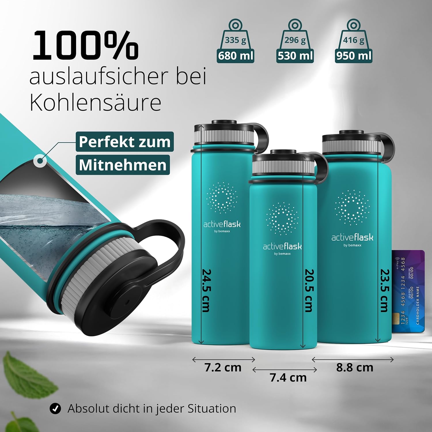 Бутилка за пиене BeMaxx Active Flask от неръждаема стомана + сламка (3 капака) без BPA (бисфенол А), непропусклива, за газирани напитки, термобутилка за велосипед, изолирана, спортна бутилка за вода, детски чай