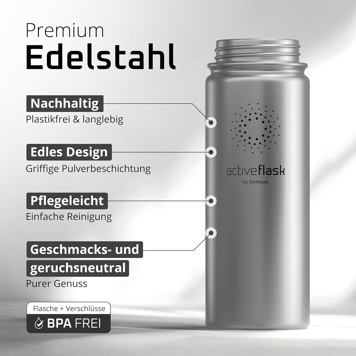 • 100% неръждаема стомана | 100% без BPA (бисфенол А) – Висококачествената полирана неръждаема стомана 18/8 не абсорбира миризми или вкусове. Сертификатите от FDA (Агенция по храните и лекарствата на САЩ) и LFGB (Тестване за контакт с храни) гарантират, че съставът, миризмата и/или вкусът на вашите напитки няма да бъдат засегнати по никакъв начин. Всички капачки на бутилки не съдържат бисфенол А и фталати, което е вредно за вашето здраве. За модели с прахово покритие и уплътнения препоръчваме ръчно миене.