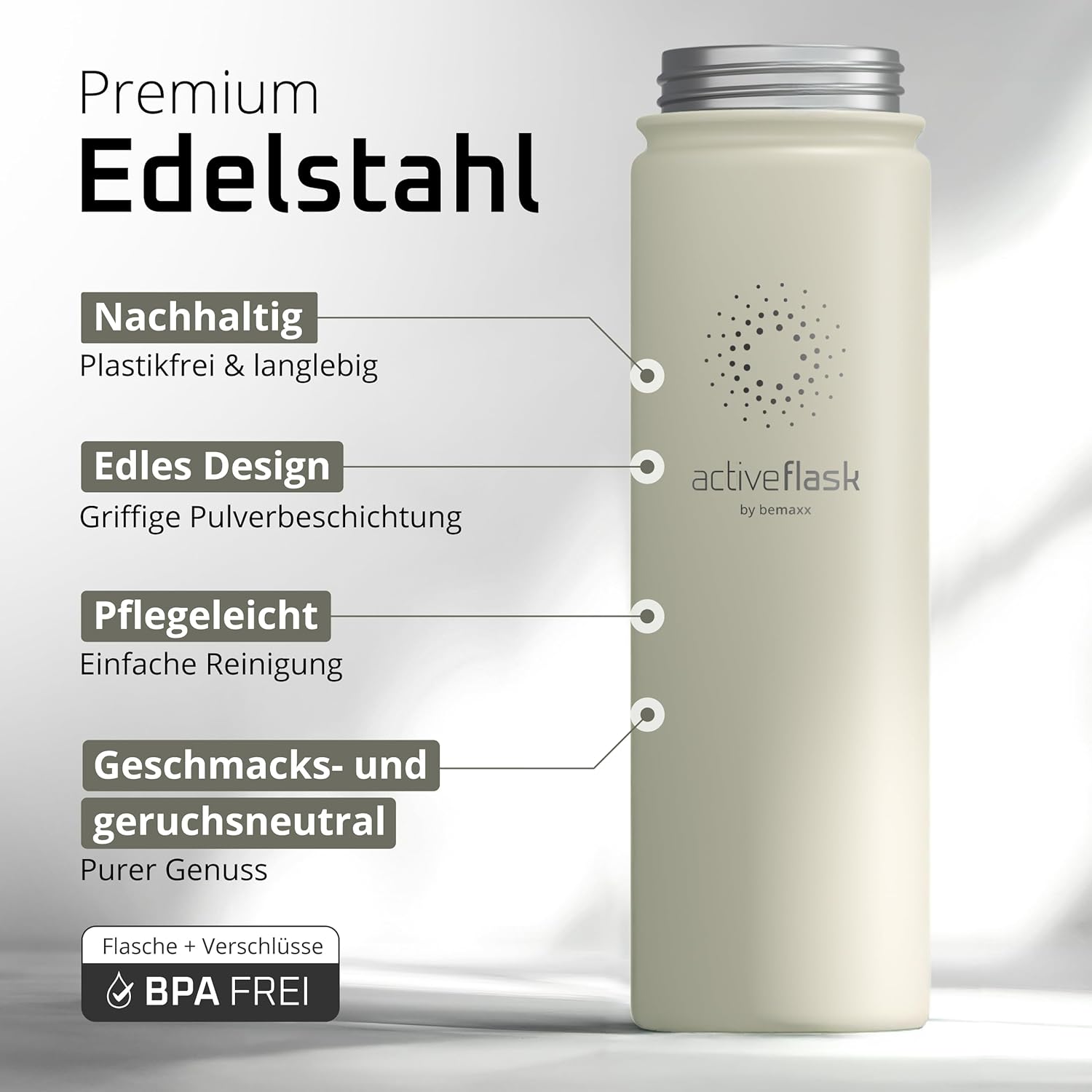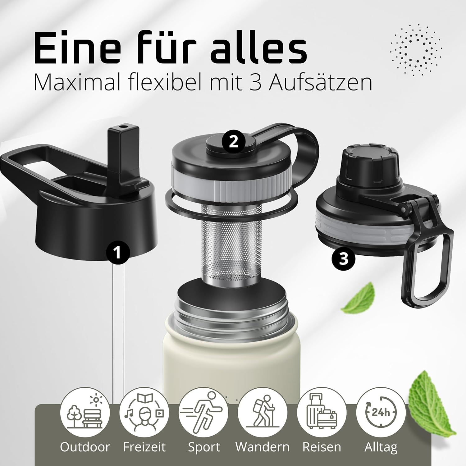 Бутилка за пиене BeMaxx Active Flask от неръждаема стомана + сламка (3 капака) без BPA (бисфенол А), непропусклива, за газирани напитки, термобутилка за велосипед, изолирана, спортна бутилка за вода, детски чай