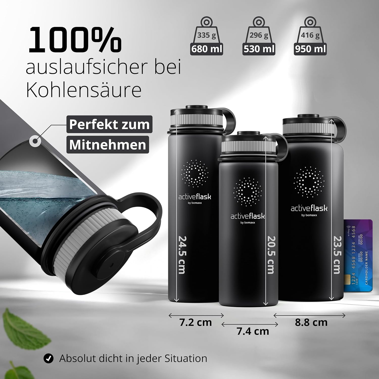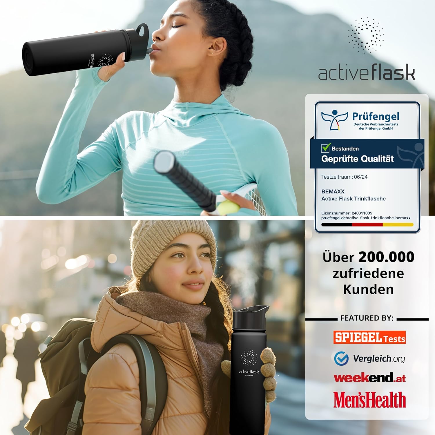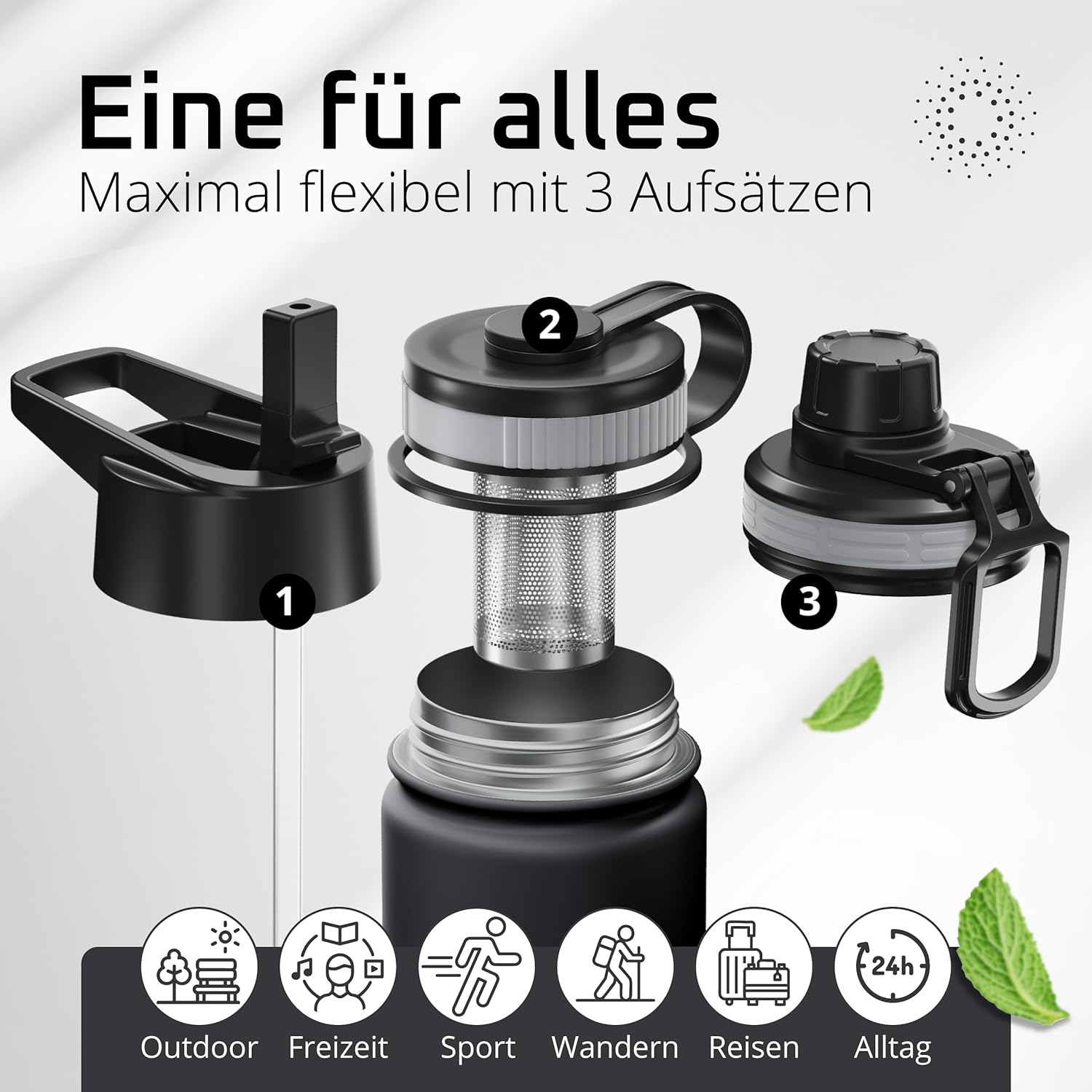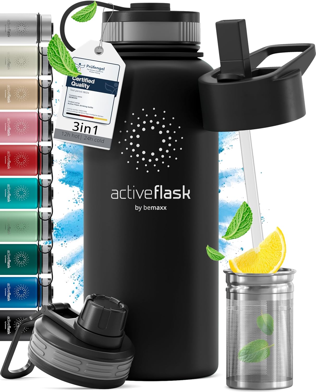 Бутилка за пиене BeMaxx Active Flask от неръждаема стомана + сламка (3 капака) без BPA (бисфенол А), непропусклива, за газирани напитки, термобутилка за велосипед, изолирана, спортна бутилка за вода, детски чай