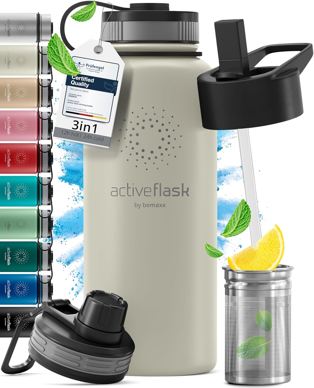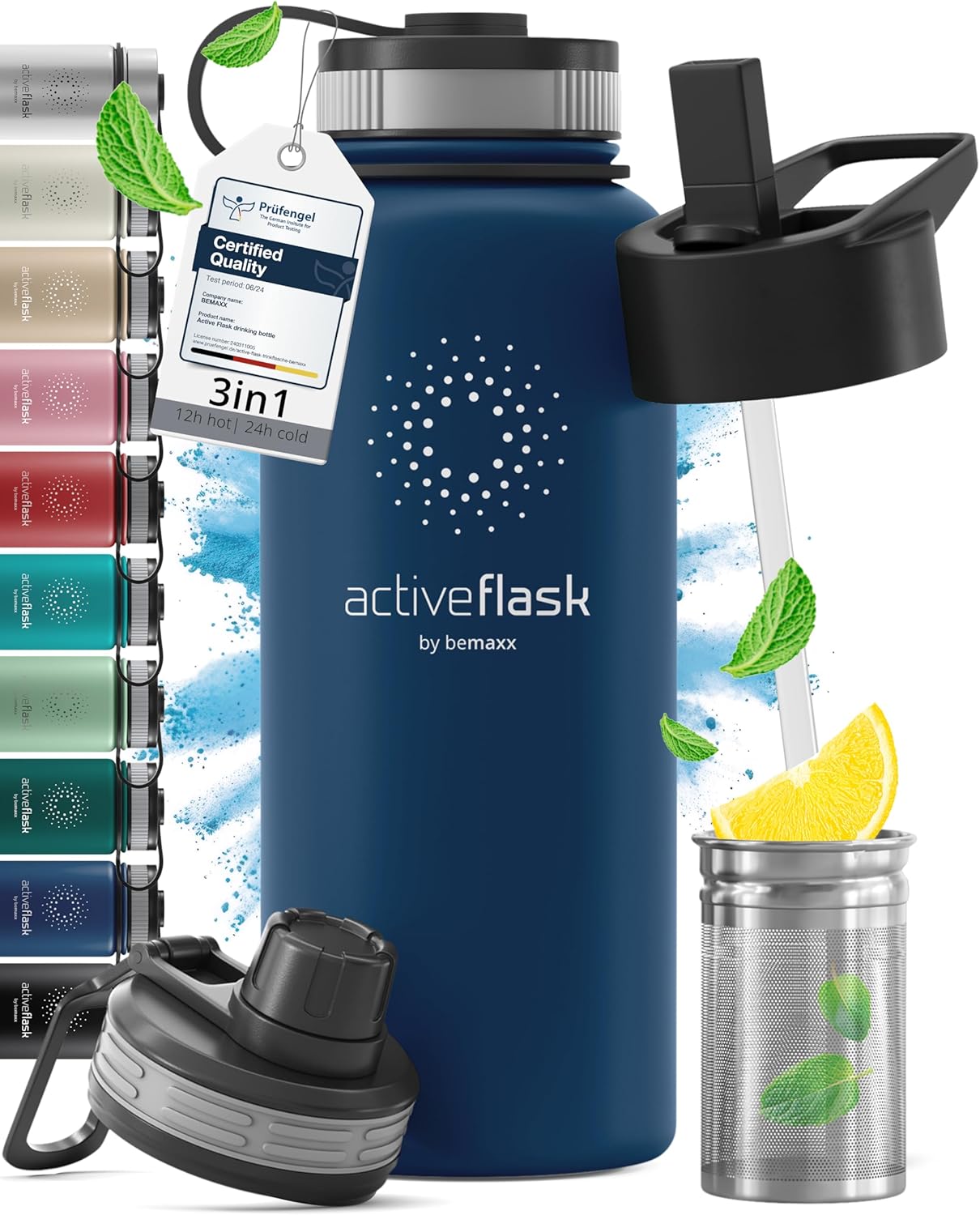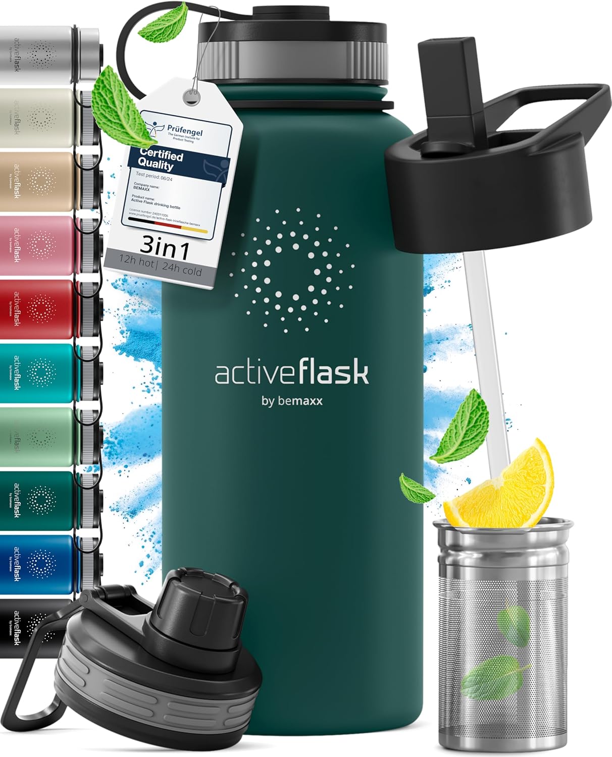 Бутилка за пиене BeMaxx Active Flask от неръждаема стомана + сламка (3 капака) без BPA (бисфенол А), непропусклива, за газирани напитки, термобутилка за велосипед, изолирана, спортна бутилка за вода, детски чай