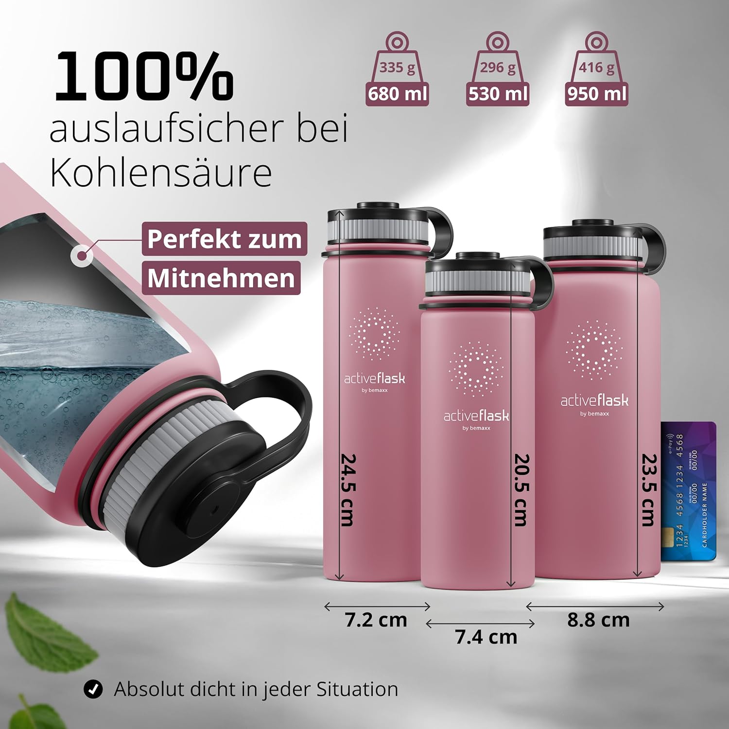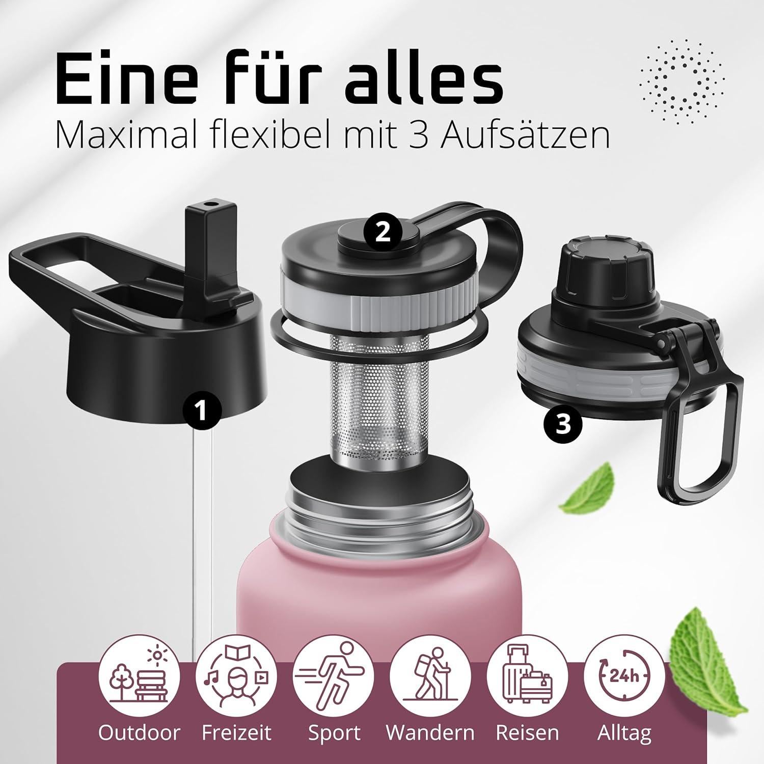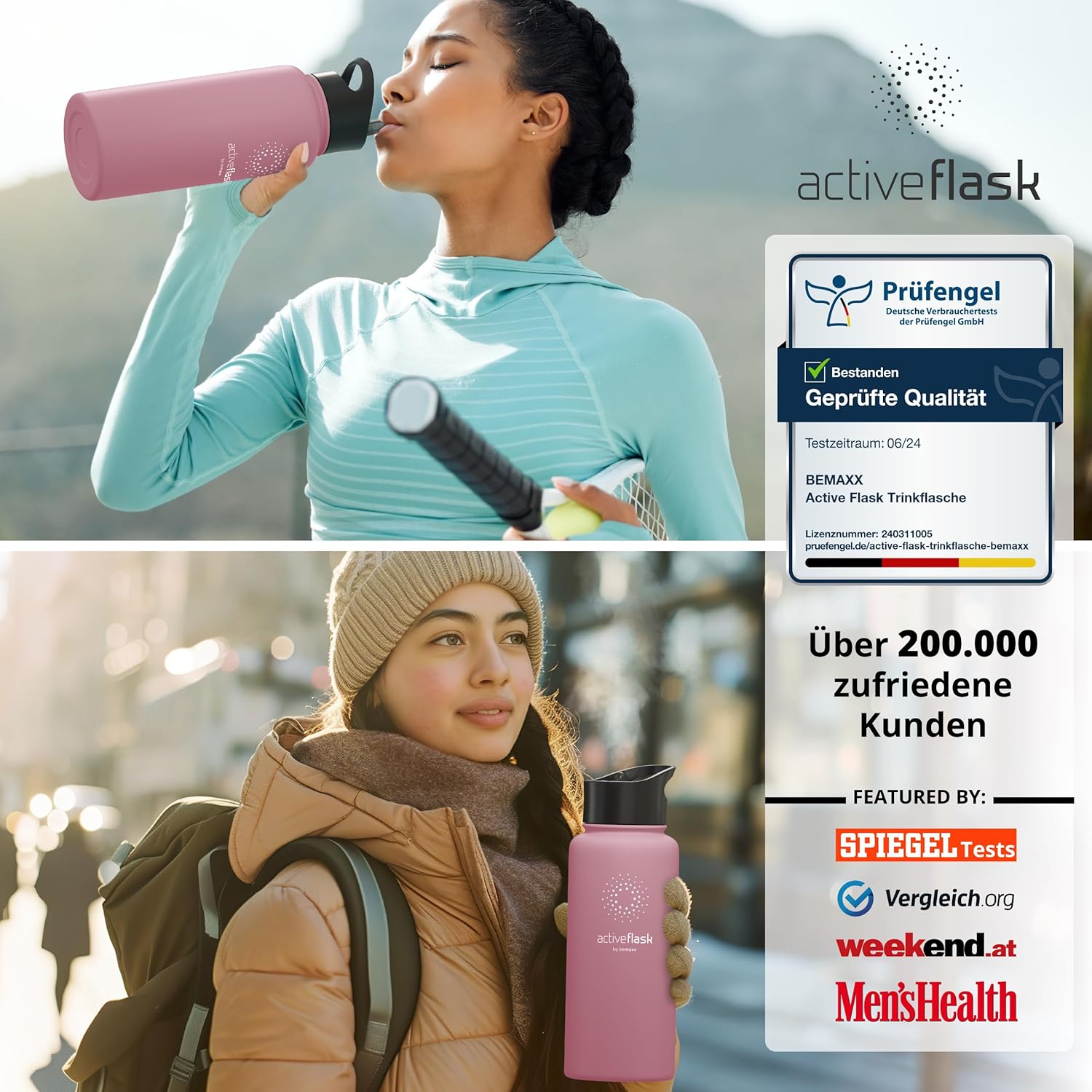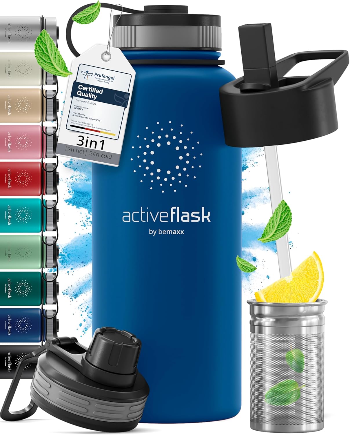 Бутилка за пиене BeMaxx Active Flask от неръждаема стомана + сламка (3 капака) без BPA (бисфенол А), непропусклива, за газирани напитки, термобутилка за велосипед, изолирана, спортна бутилка за вода, детски чай