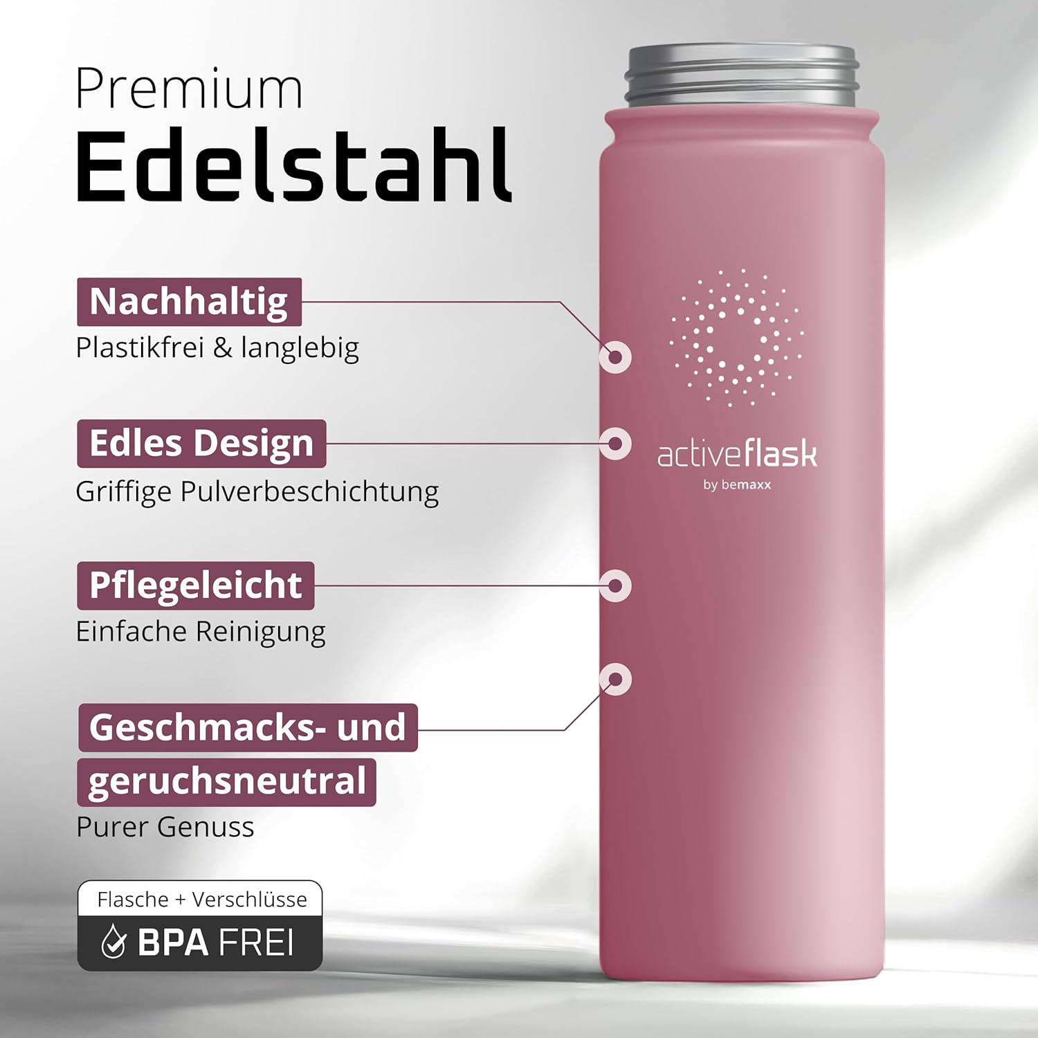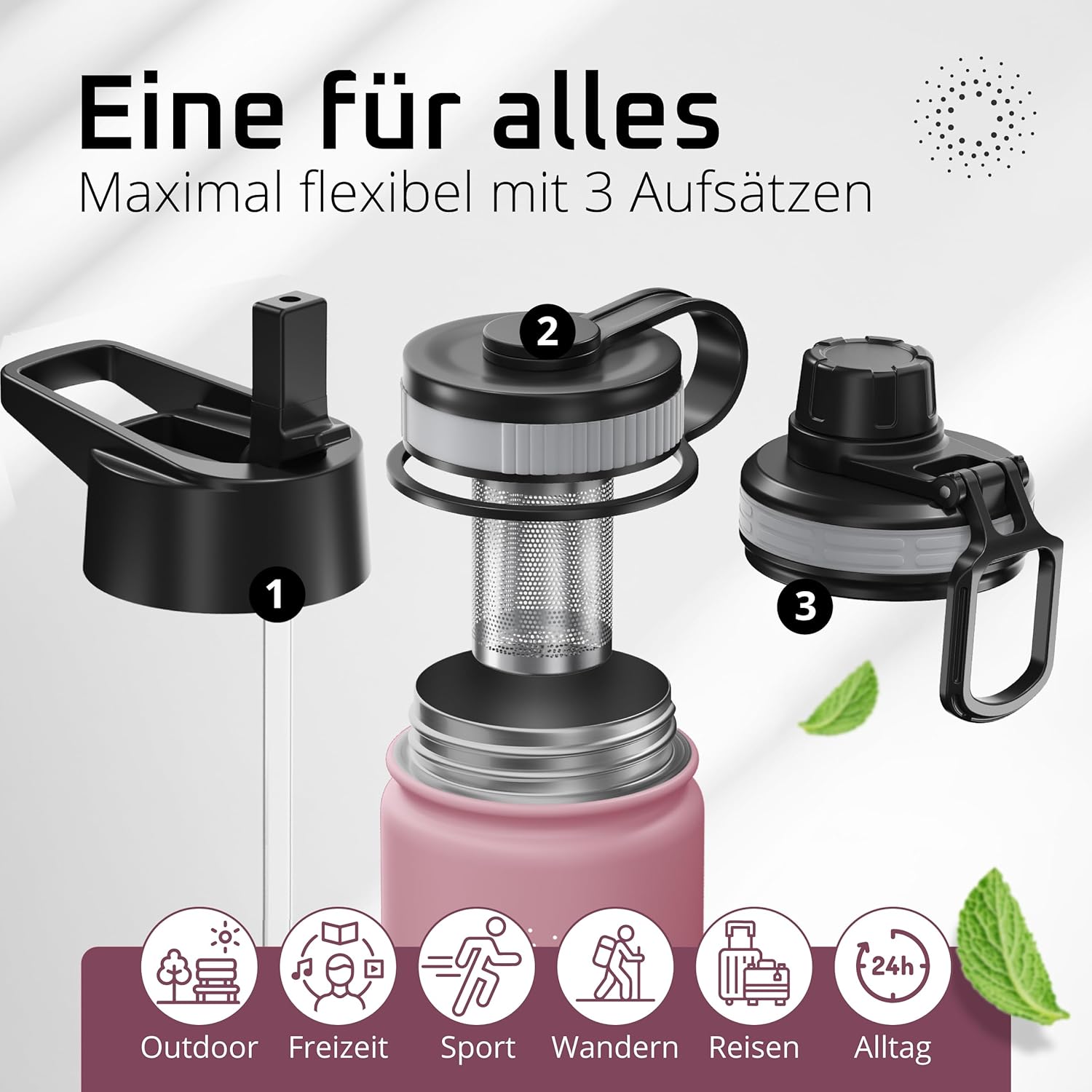 Бутилка за пиене BeMaxx Active Flask от неръждаема стомана + сламка (3 капака) без BPA (бисфенол А), непропусклива, за газирани напитки, термобутилка за велосипед, изолирана, спортна бутилка за вода, детски чай