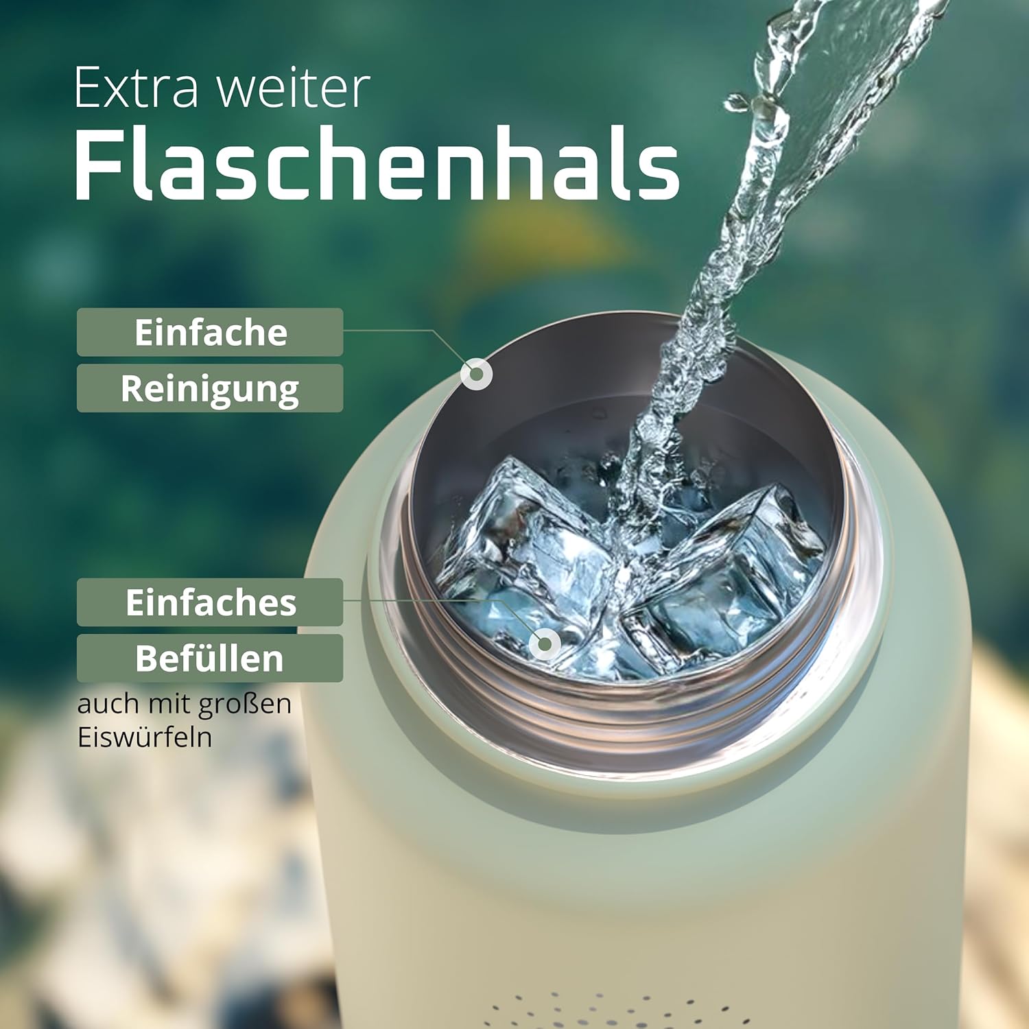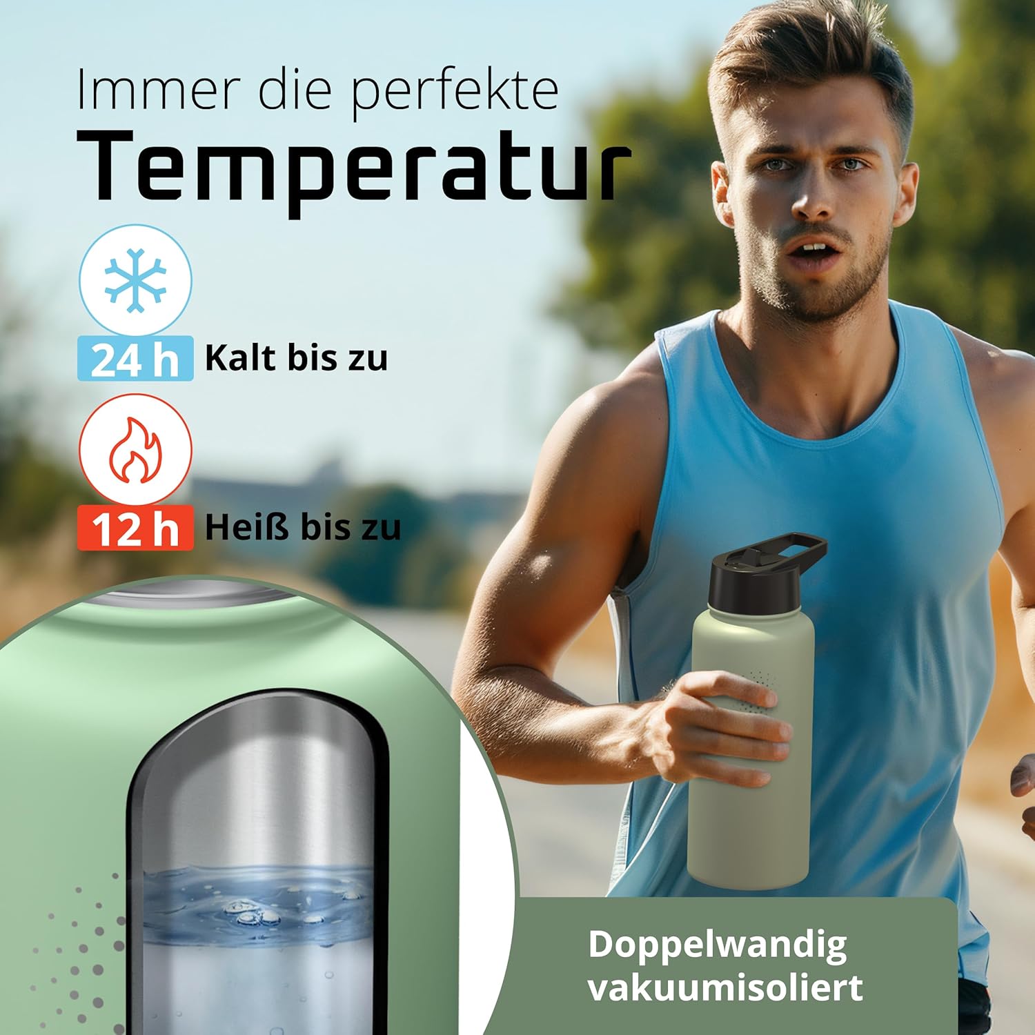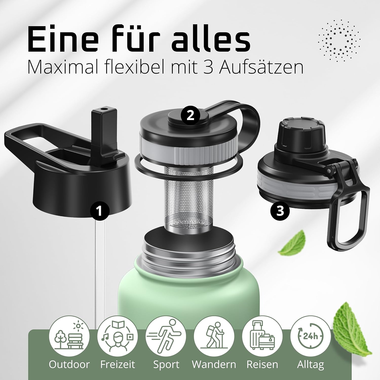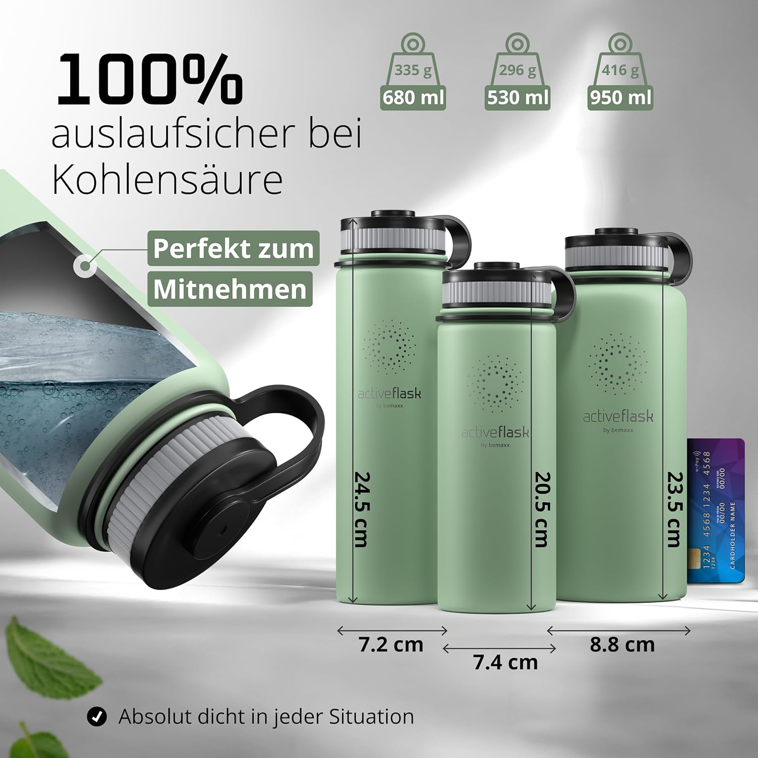 • Победител в теста: 12 часа топло и 25 часа студено | Вземете оригинала в обновен дизайн – двустенната вакуумно изолирана бутилка за пиене от неръждаема стомана с 3 различни капачки за ежедневна употреба, спорт и дейности на открито. Височина: 25 см, диаметър 9,3 см, обем: 950 мл. Тегло: 416 г. (*Настоящ победител в сравнението (категории „бутилки за пиене“ и „бутилки за пиене от неръждаема стомана“) atvergleich.org от 02/2017).