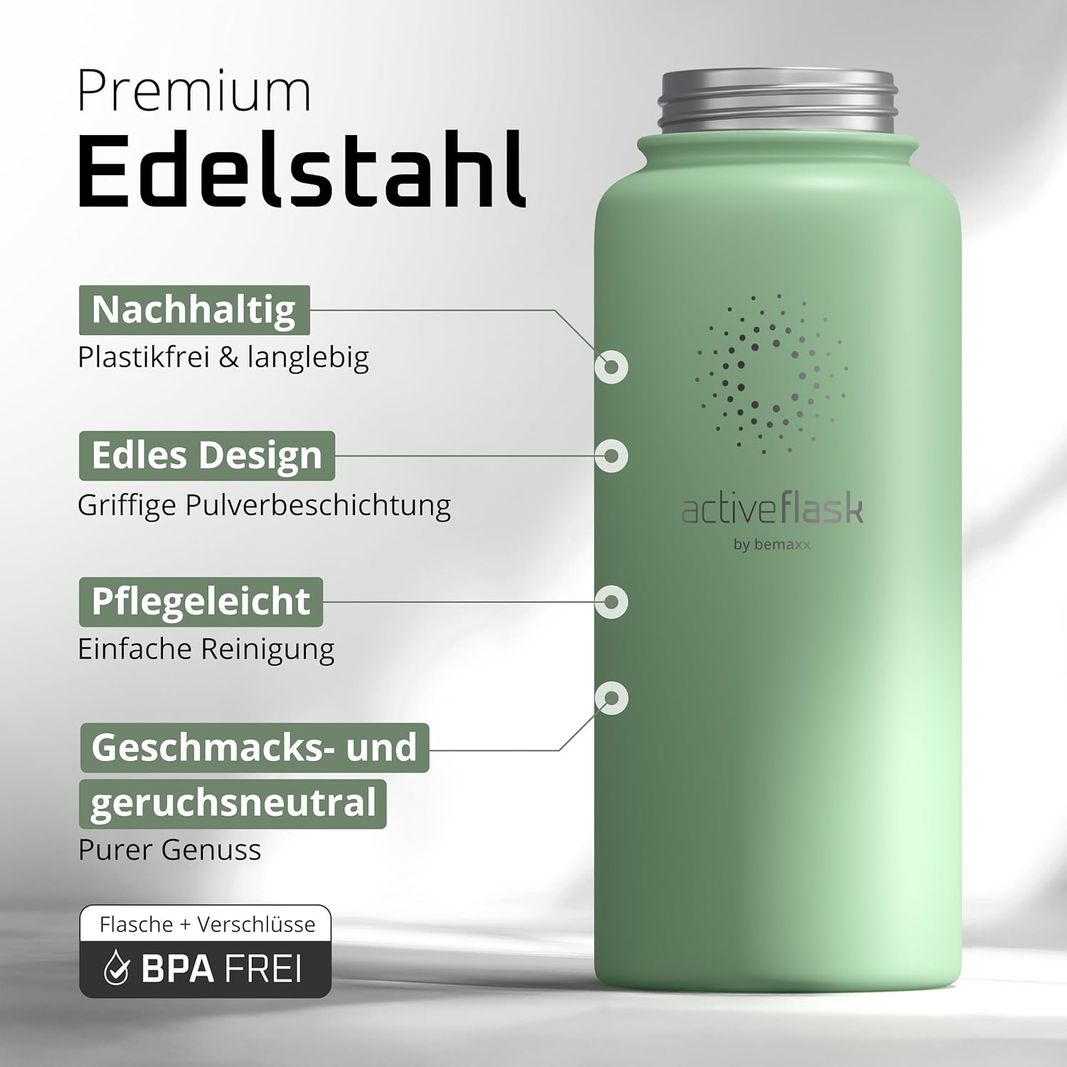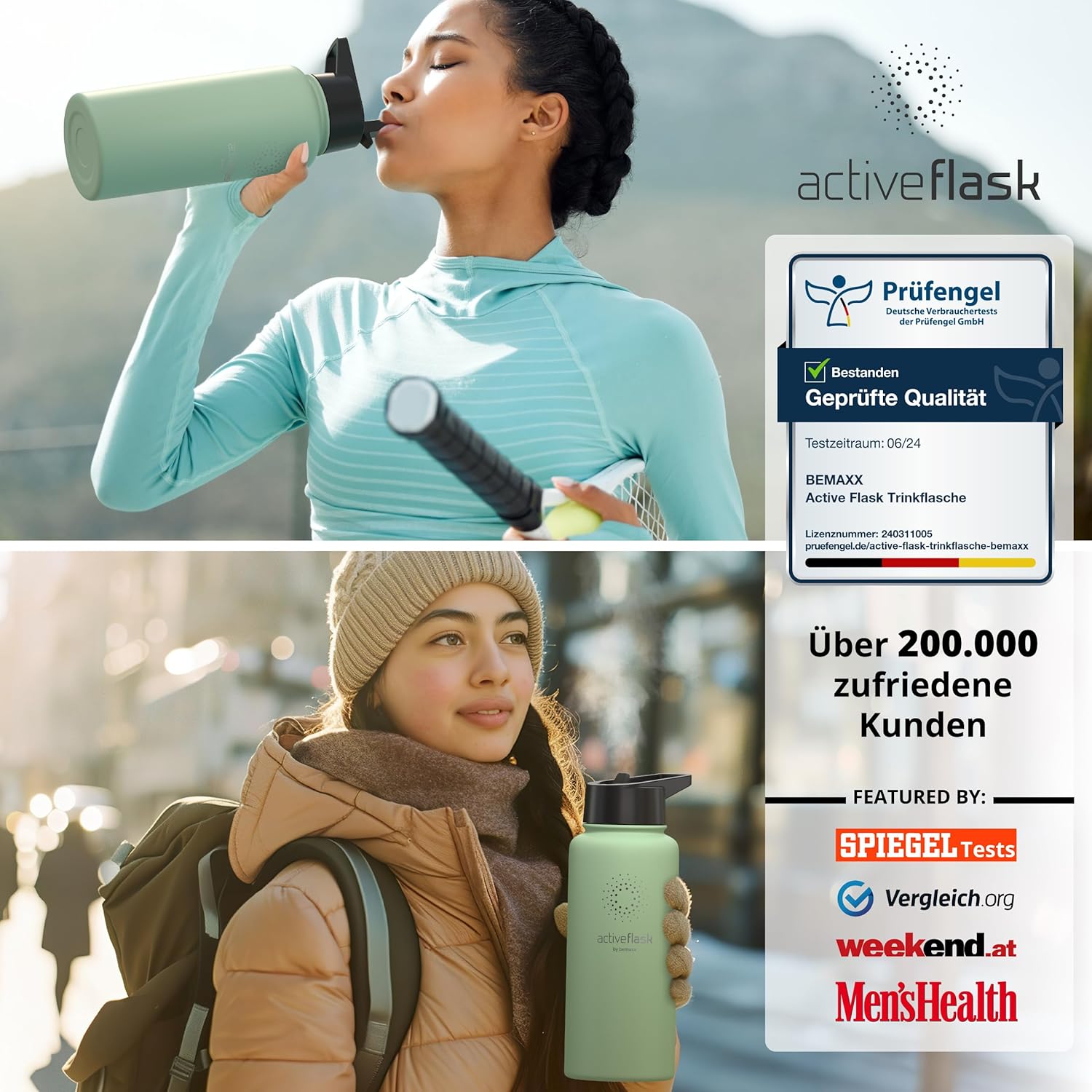 Бутилка за пиене BeMaxx Active Flask от неръждаема стомана + сламка (3 капака) без BPA (бисфенол А), непропусклива, за газирани напитки, термобутилка за велосипед, изолирана, спортна бутилка за вода, детски чай