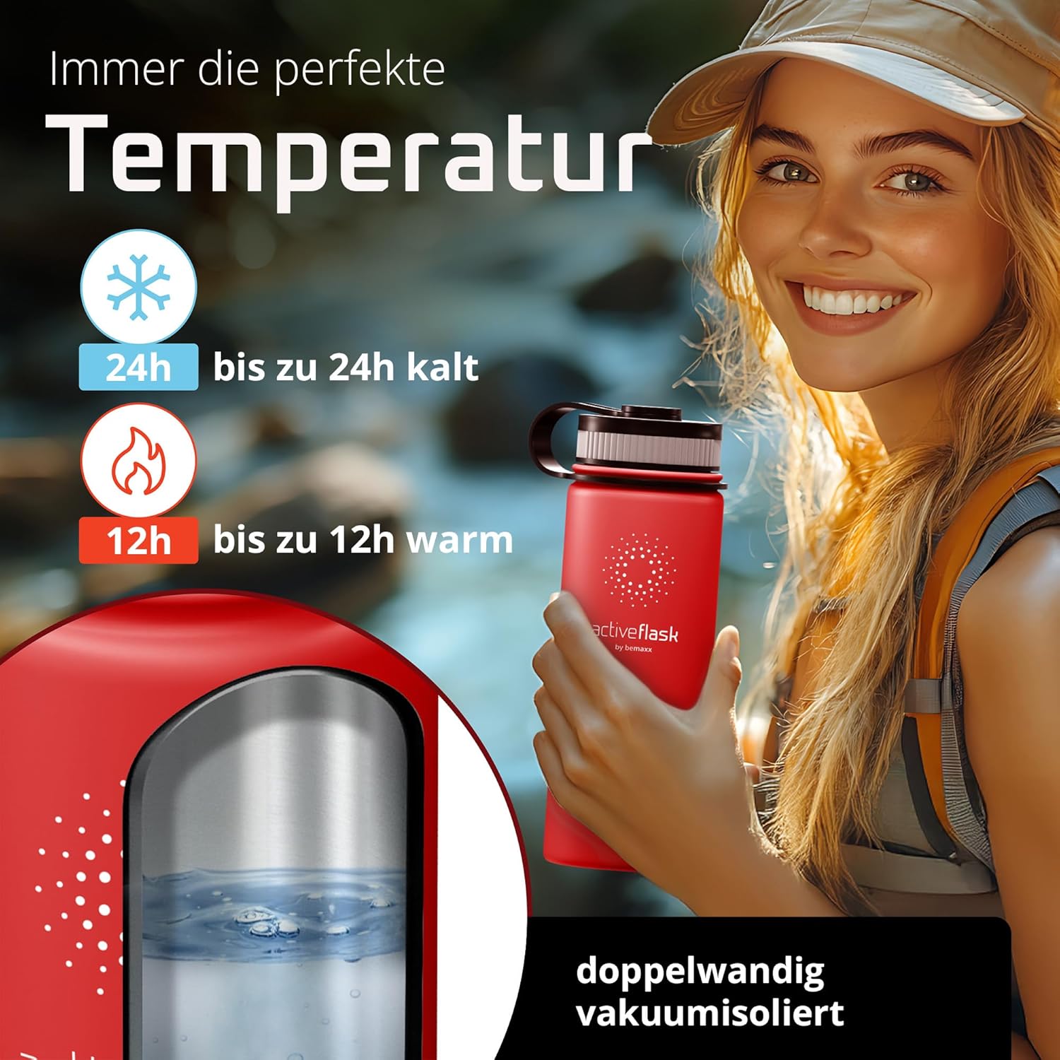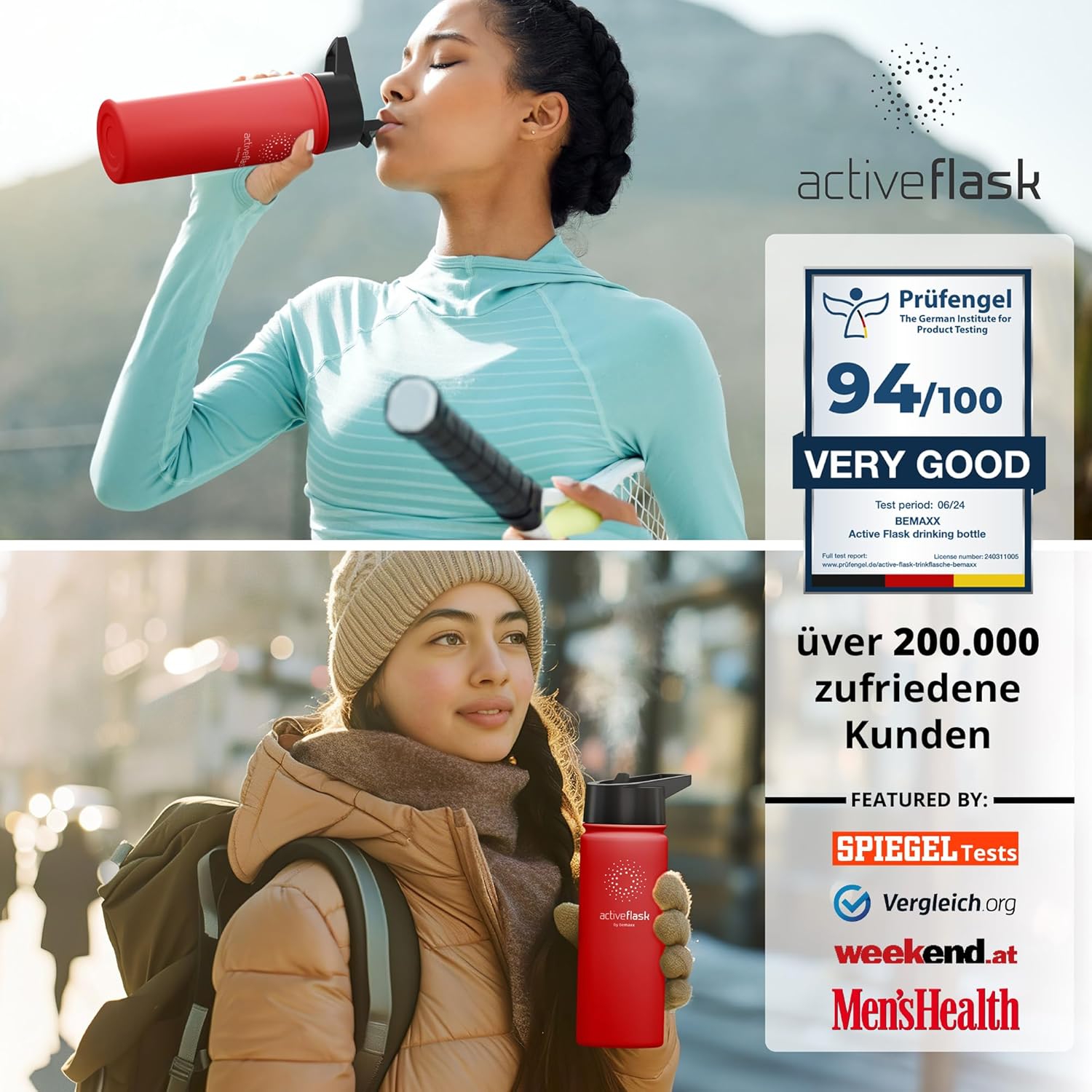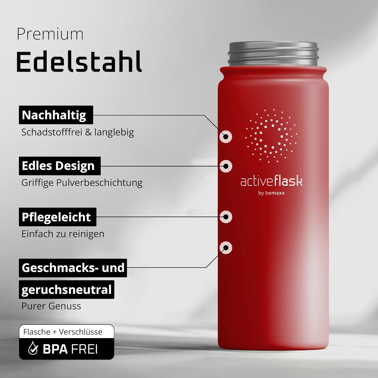 Бутилка за пиене BeMaxx Active Flask от неръждаема стомана + сламка (3 капака) без BPA (бисфенол А), непропусклива, за газирани напитки, термобутилка за велосипед, изолирана, спортна бутилка за вода, детски чай