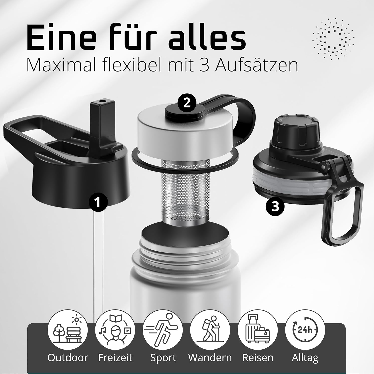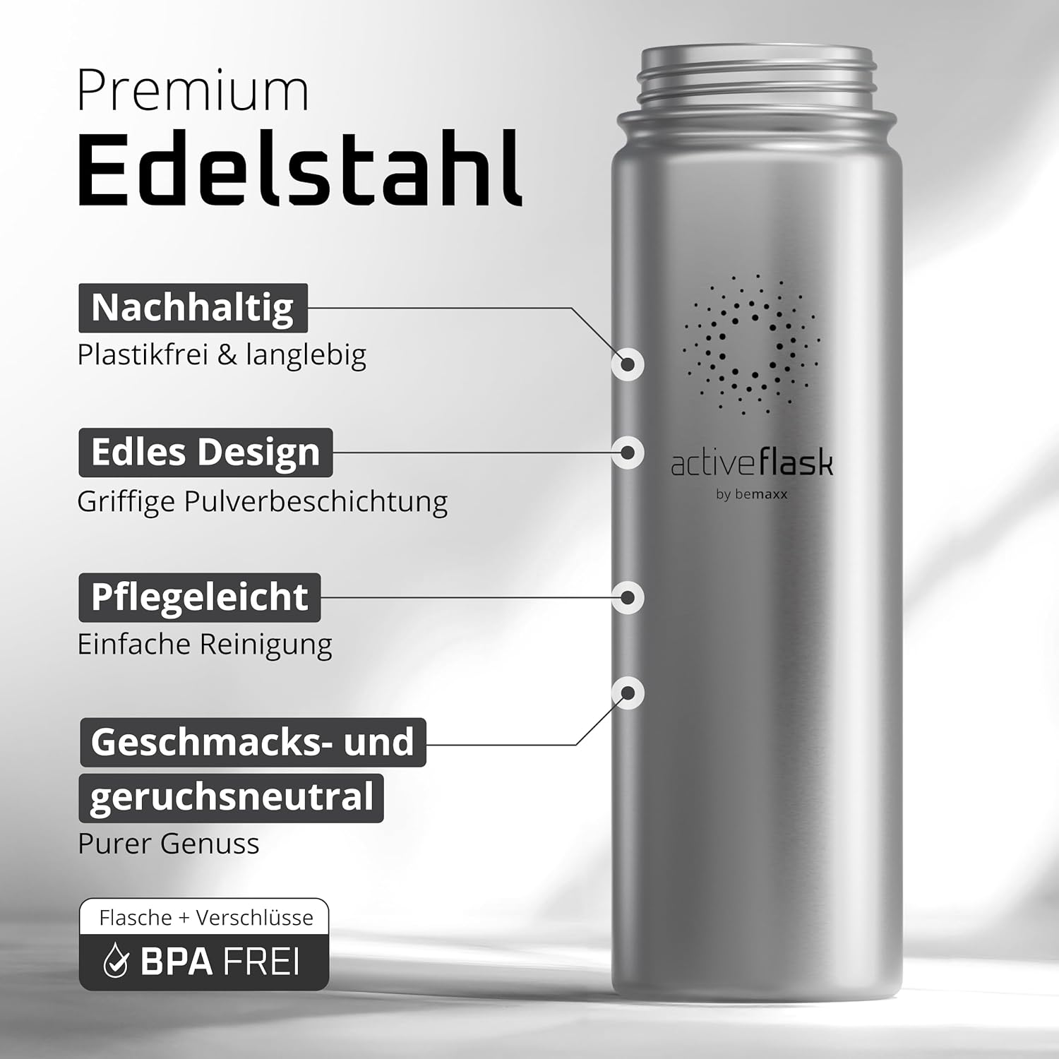 Бутилка за пиене BeMaxx Active Flask от неръждаема стомана + сламка (3 капака) без BPA (бисфенол А), непропусклива, за газирани напитки, термобутилка за велосипед, изолирана, спортна бутилка за вода, детски чай
