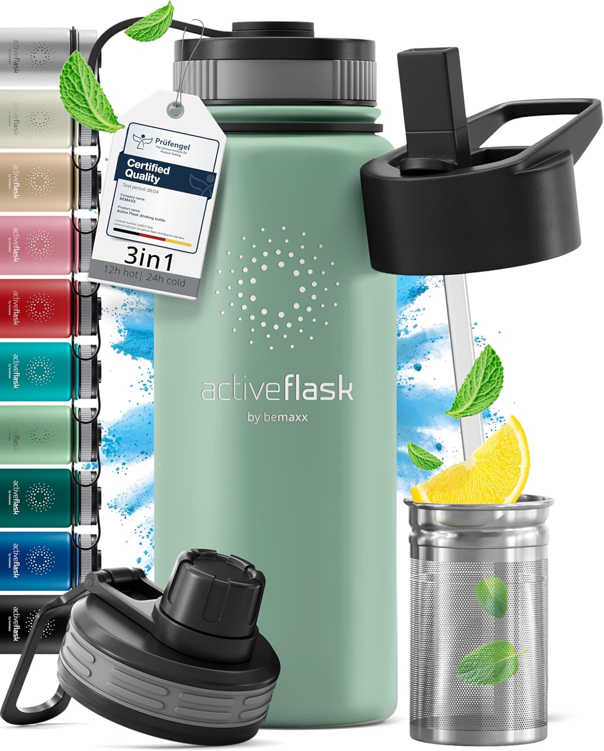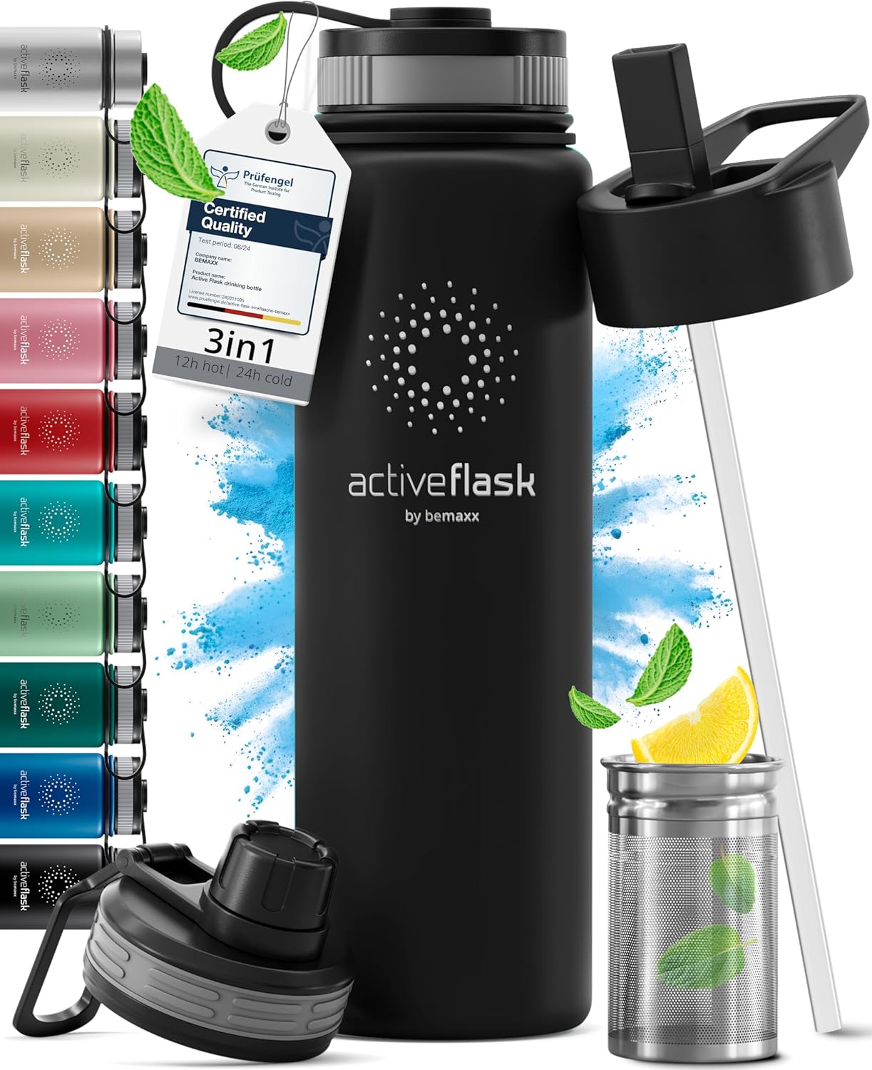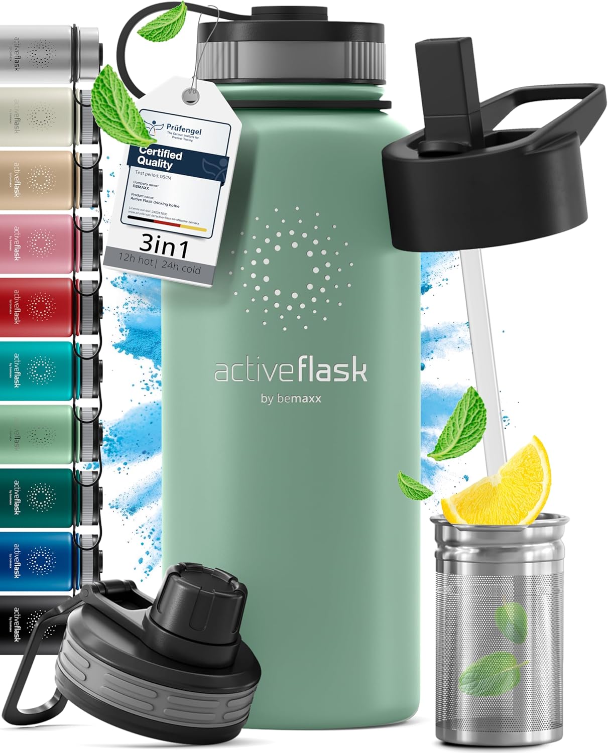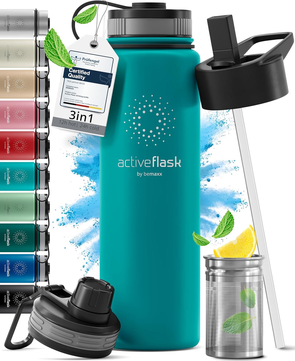 Бутилка за вода от неръждаема стомана Active Flask + сламка (3 капака) Без BPA, непропусклива, подходяща за газирани напитки, бутилка за вода, термос за велосипеди, изолирана бутилка, спортна бутилка за вода, детска