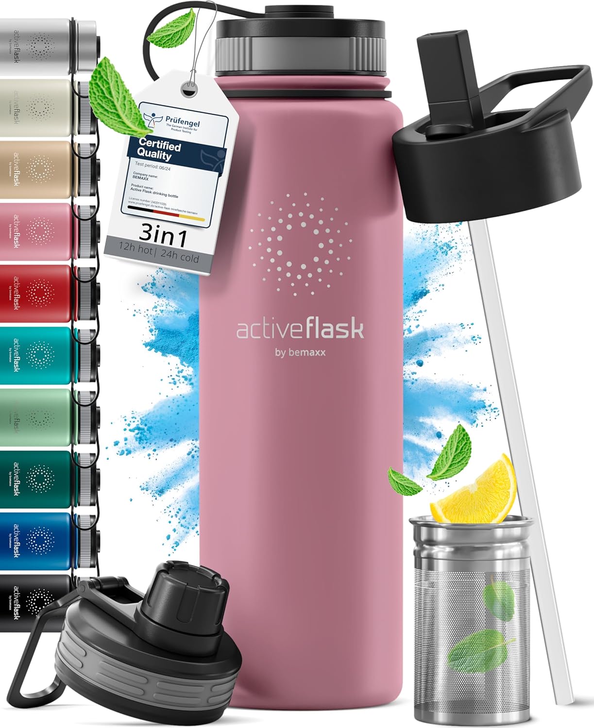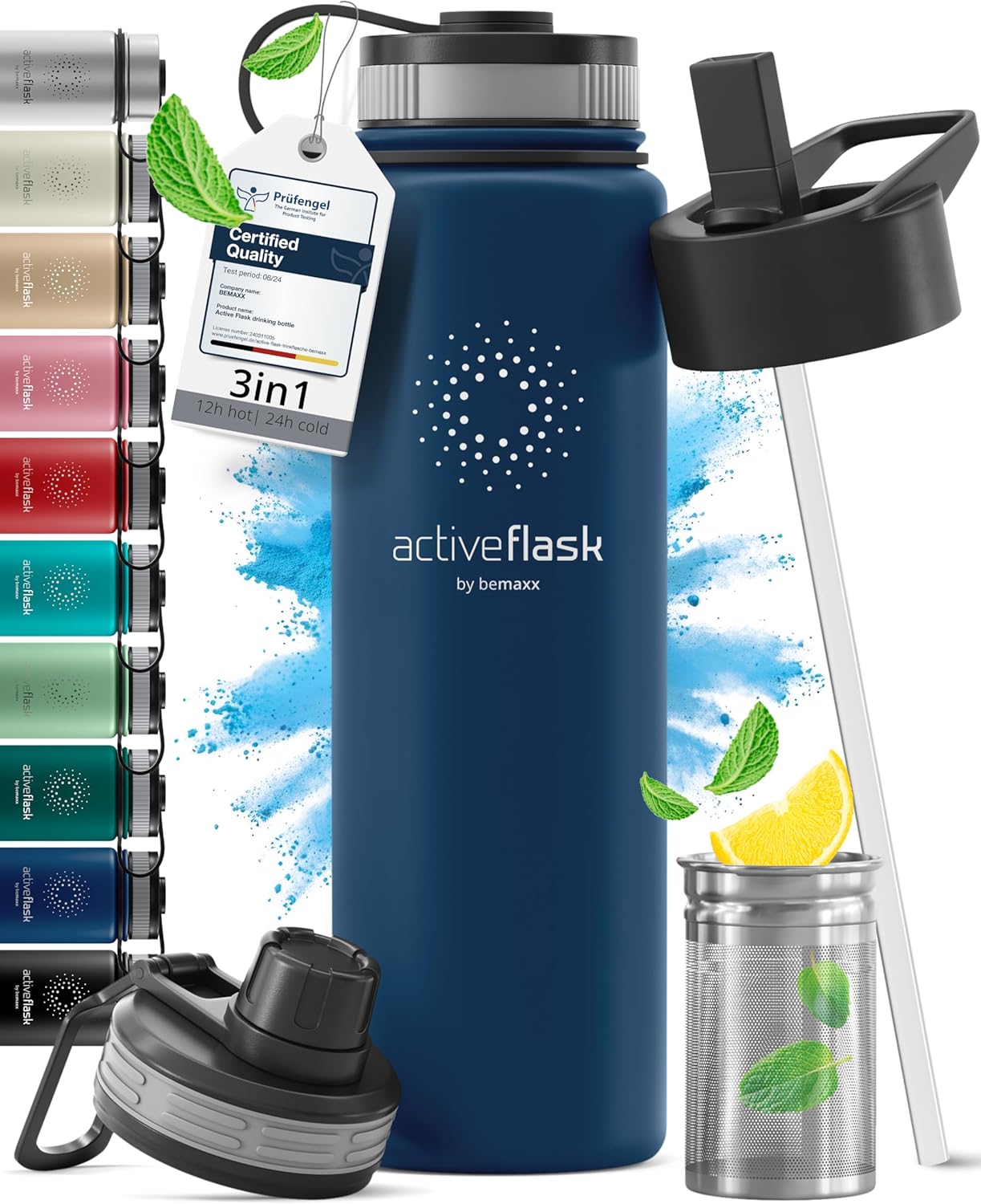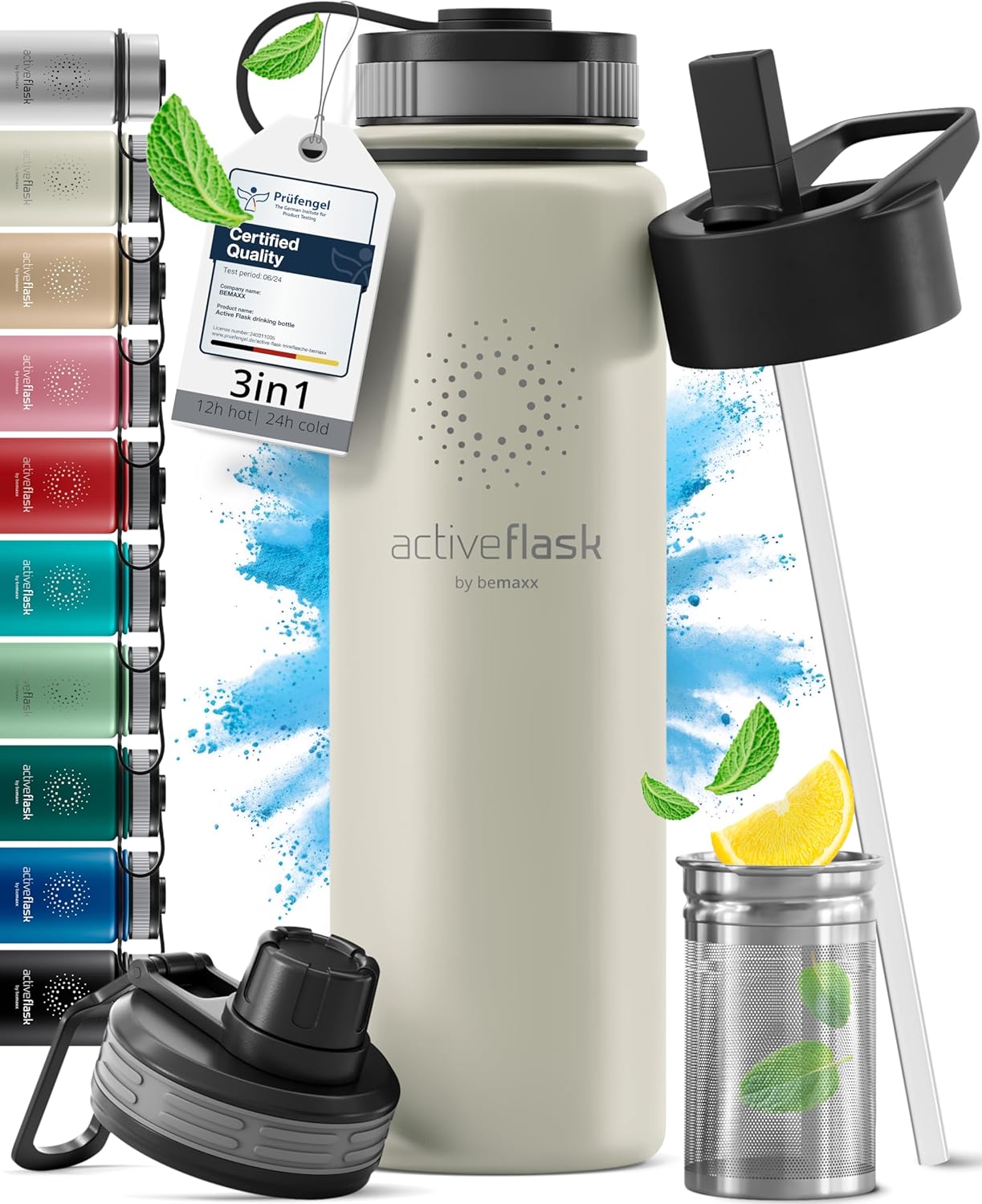 Бутилка за вода от неръждаема стомана Active Flask + сламка (3 капака) Без BPA, непропусклива, подходяща за газирани напитки, бутилка за вода, термос за велосипеди, изолирана бутилка, спортна бутилка за вода, детска
