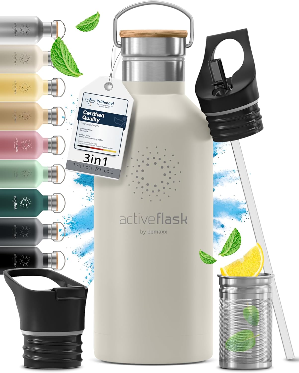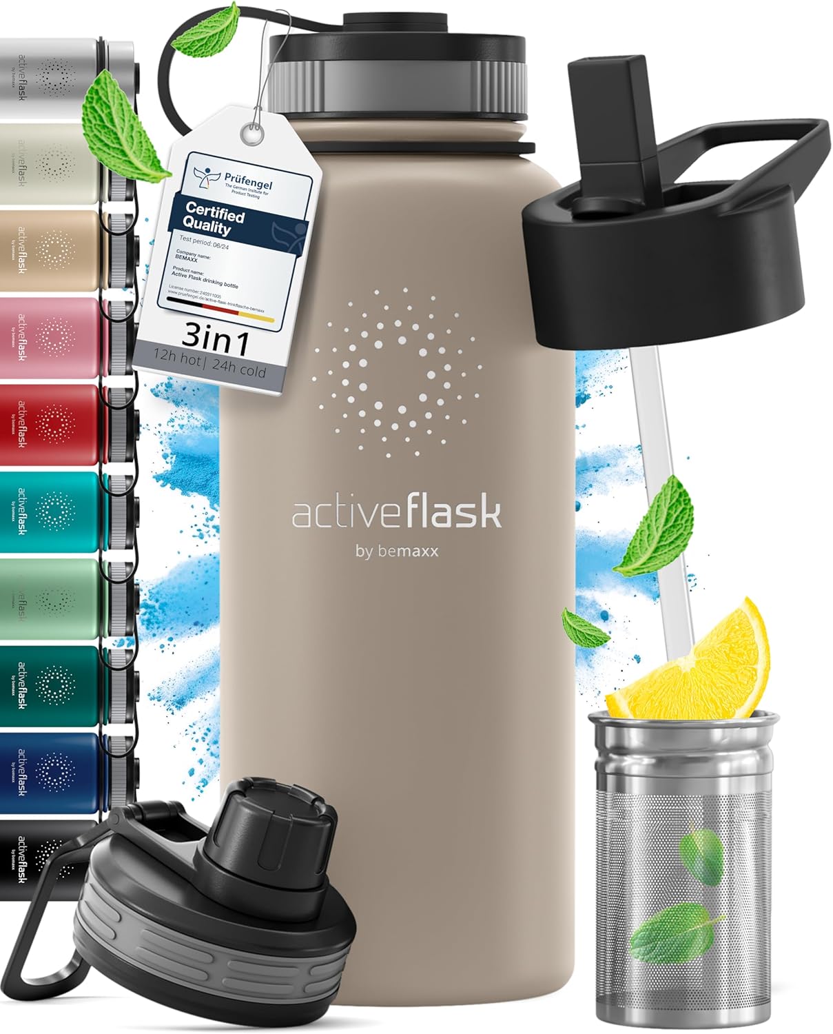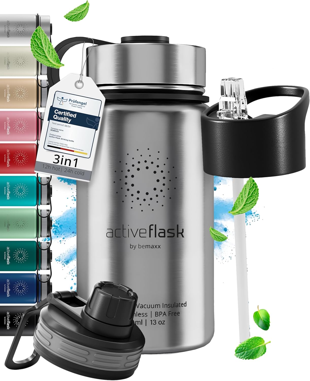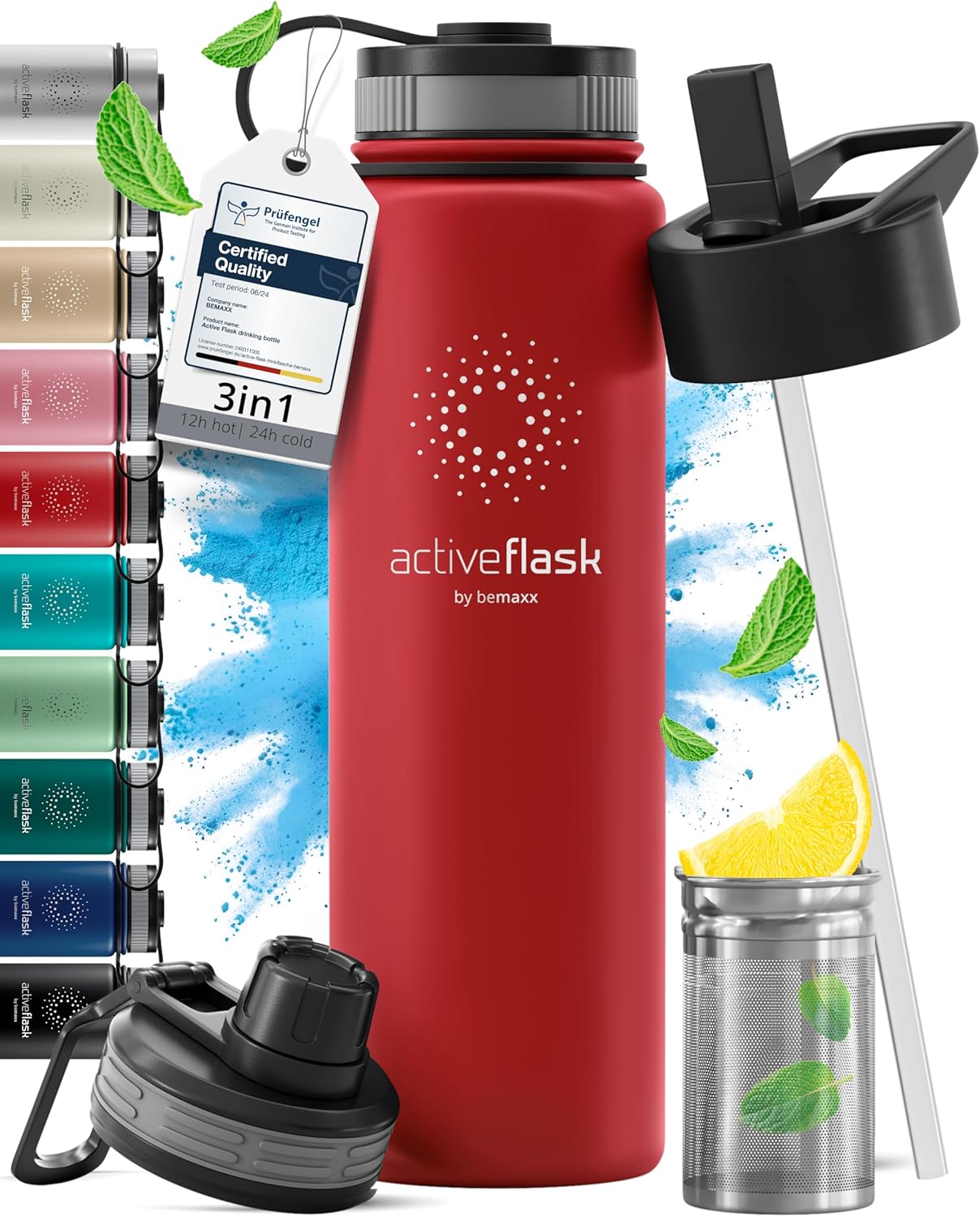 Бутилка за вода от неръждаема стомана Active Flask + сламка (3 капака) Без BPA, непропусклива, подходяща за газирани напитки, бутилка за вода, термос за велосипеди, изолирана бутилка, спортна бутилка за вода, детска