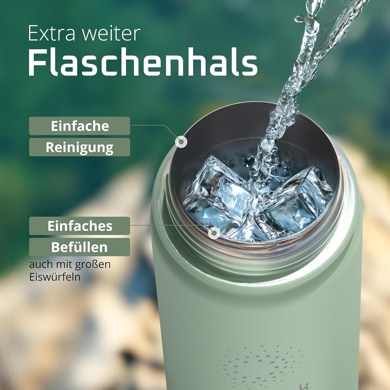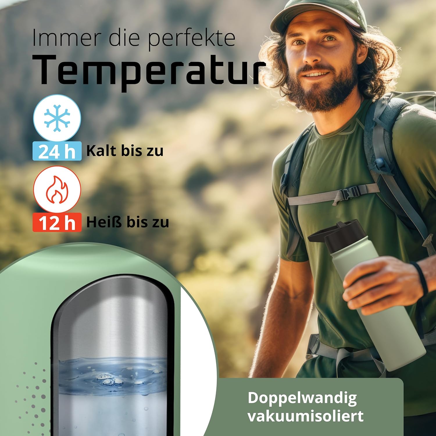 • Победител в теста: 12 часа топло и 25 часа студено | Вземете оригинала в обновен дизайн – двустенната вакуумно изолирана бутилка за пиене от неръждаема стомана с 3 различни капачки за ежедневна употреба, спорт и дейности на открито. Височина: 25 см, диаметър 9,3 см, обем: 950 мл. Тегло: 416 г. (*Настоящ победител в сравнението (категории „бутилки за пиене“ и „бутилки за пиене от неръждаема стомана“) atvergleich.org от 02/2017).