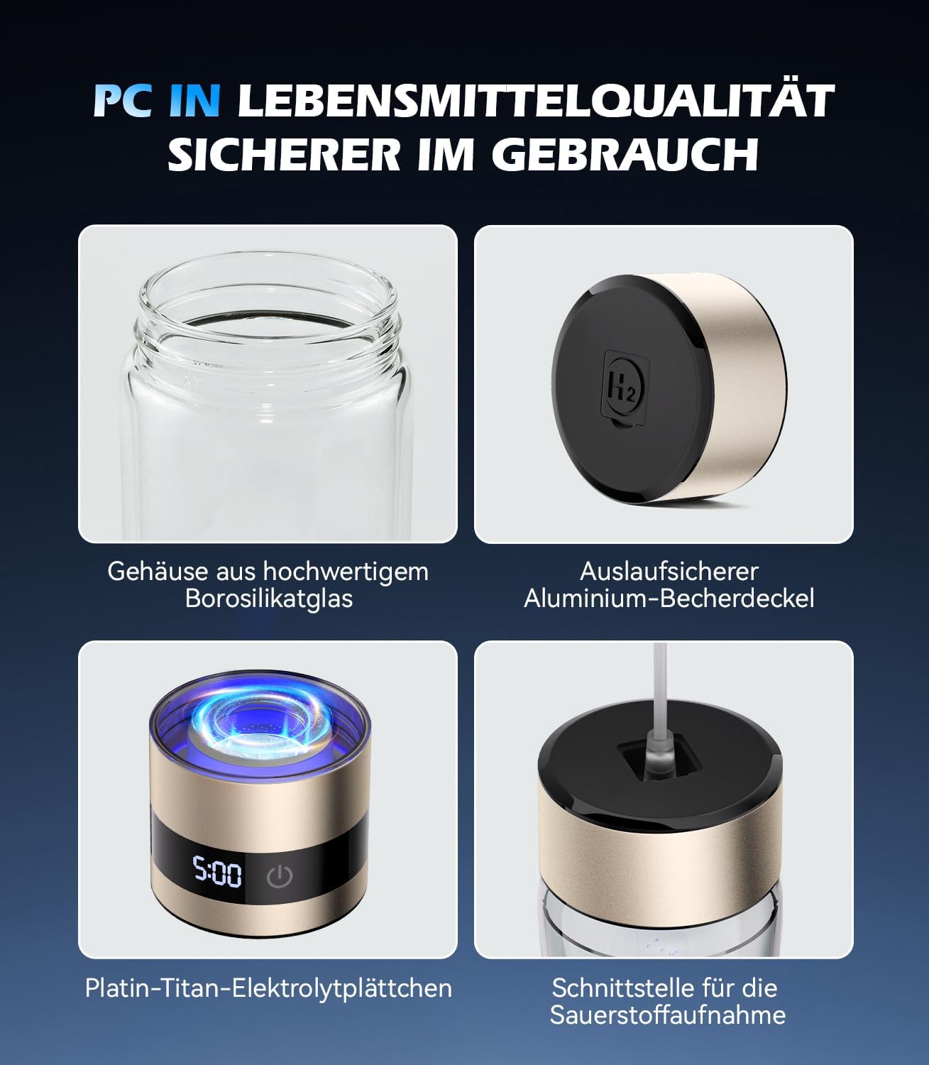 • Сертифицирано по ROHS боросиликатно стъкло - безопасно за храната: Нашата водородна бутилка е изработена от висококачествено, издръжливо боросиликатно стъкло и носи сертификат RoHS, който гарантира безопасността на храните. Неплъзгащата се EVA подложка и здравият капак гарантират безопасна и удобна употреба.
