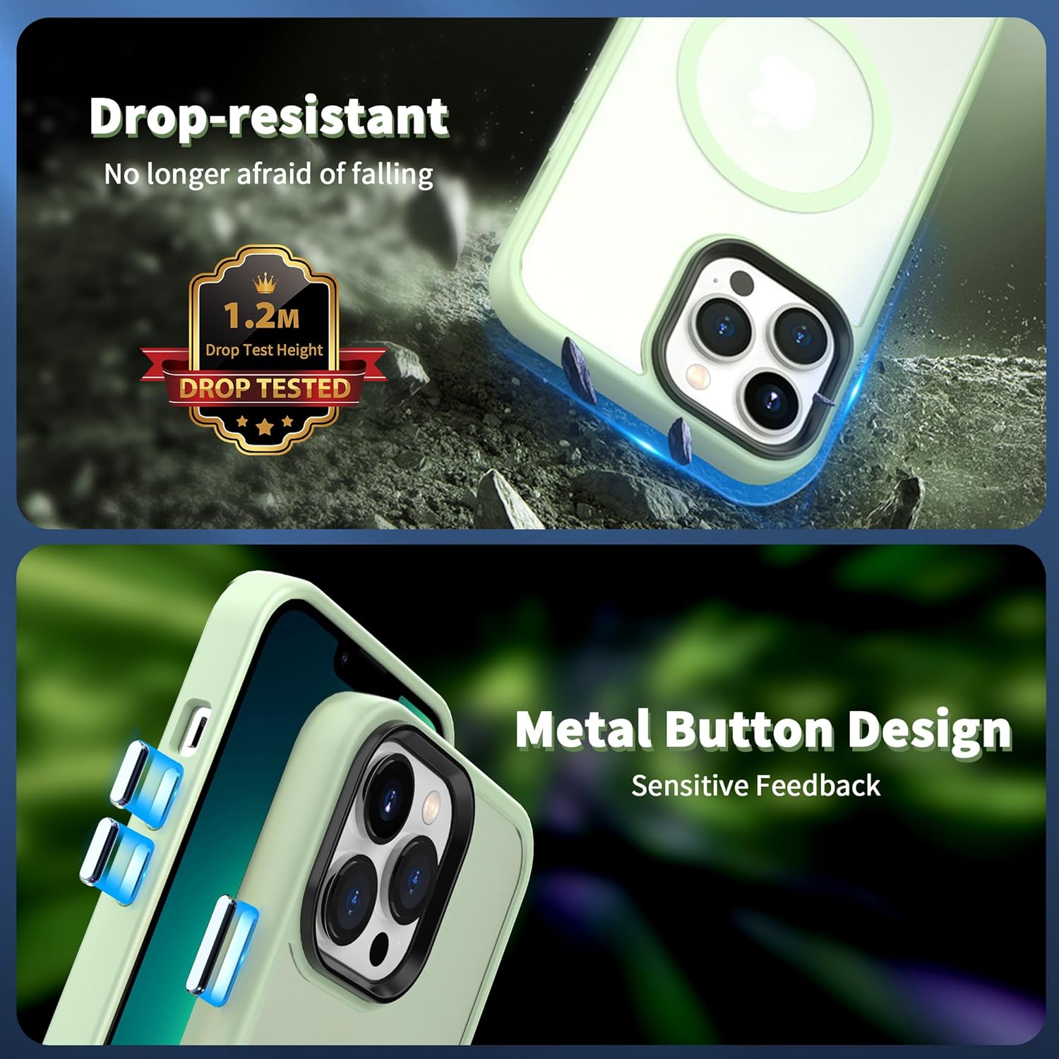 • Защита от 3 м, отговаряща на военни стандарти: Преминава тестове за падане и може да издържи на падания от височина до 3 м. Този матов заден капак за iPhone 15 е изработен от твърд поликарбонат (PC) с гъвкави, абсорбиращи ударите термопластични полиуретанови (TPU) подложки по краищата и разполага с четири въздушни възглавници в ъглите, които абсорбират ударите, предотвратявайки случайни падания, сблъсъци и надрасквания.