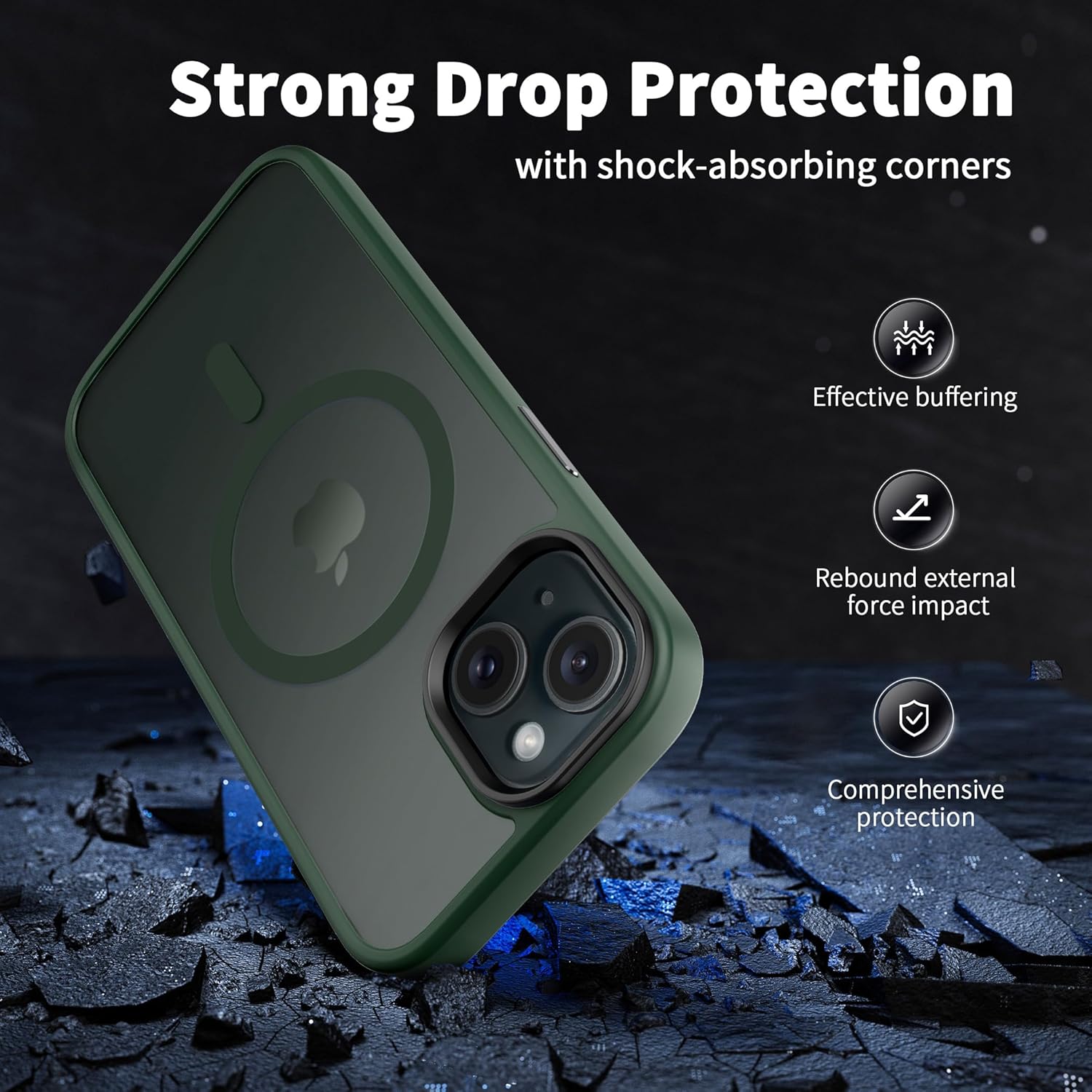 • Защита от 3 м, отговаряща на военни стандарти: Преминава тестове за падане и може да издържи на падания от височина до 3 м. Този матов заден капак за iPhone 15 е изработен от твърд поликарбонат (PC) с гъвкави, абсорбиращи ударите термопластични полиуретанови (TPU) подложки по краищата и разполага с четири въздушни възглавници в ъглите, които абсорбират ударите, предотвратявайки случайни падания, сблъсъци и надрасквания.