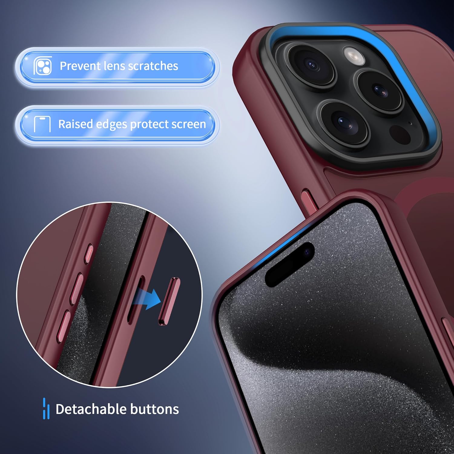 • Матирана текстура на гърба: Този калъф за iPhone 15 е изработен от висококачествен матов термопластичен полиуретан (TPU) и полупрозрачен поликарбонат (PC). Полупрозрачният матов гръб осигурява добро сцепление, а нано антиоксидантното покритие ефективно предпазва от замърсявания, пот и драскотини. Предлага се в няколко цвята и подчертава цвета и логото на устройството.