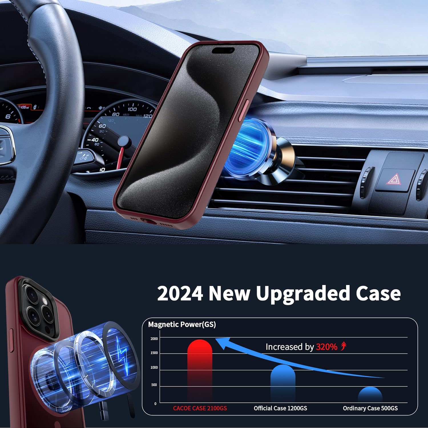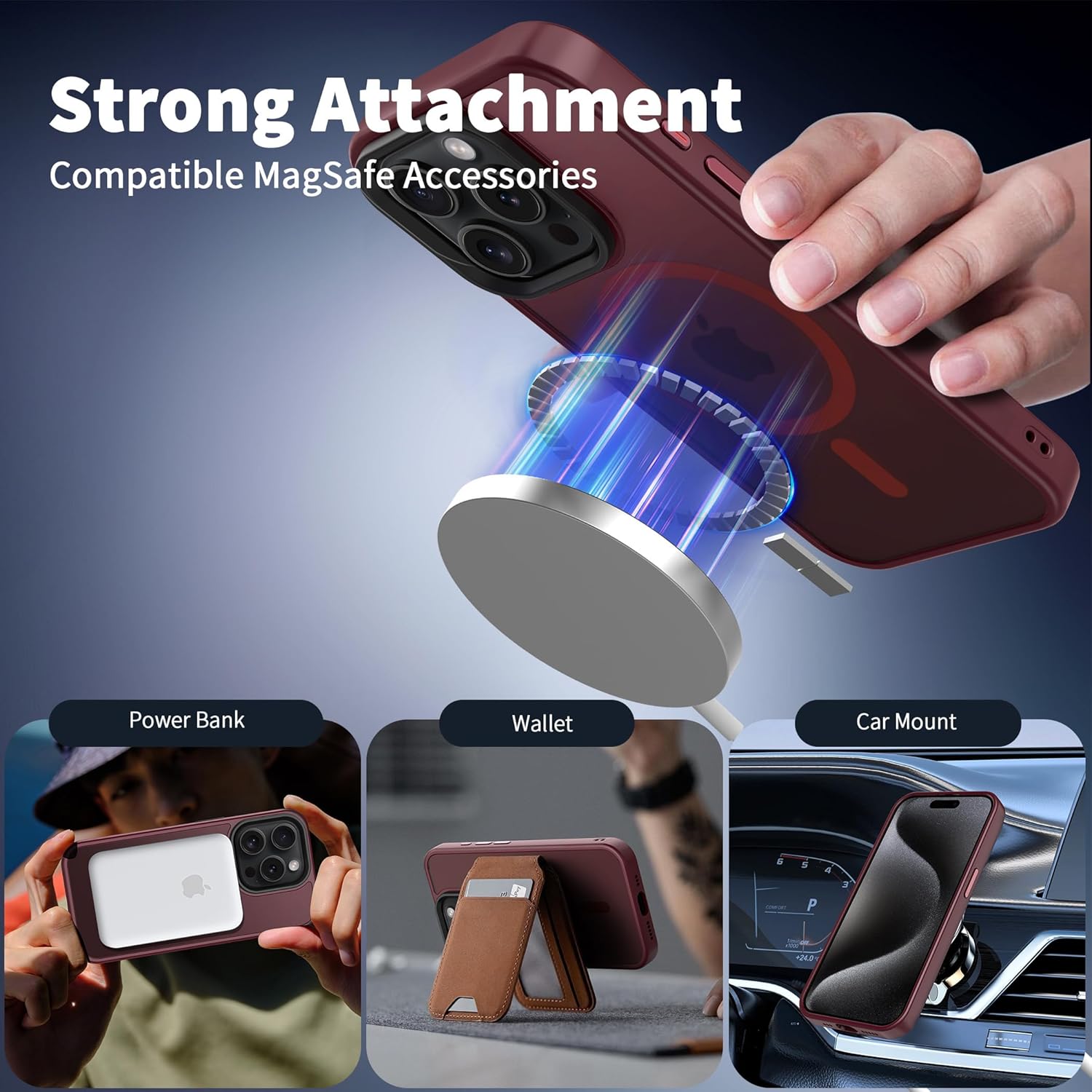 • Силен магнетизъм: Магнитният калъф за iPhone 15 е оборудван с 37 свръхсилни магнита N52, чиято магнитна сила е 2400 GS – седем пъти по-силна от тази на обикновените магнити. Следователно, той няма да падне, дори ако го разклатите енергично по време на зареждане. Съвместим е с MagSafe, магнитни портфейли, магнитни стойки за кола и магнитни зарядни устройства.