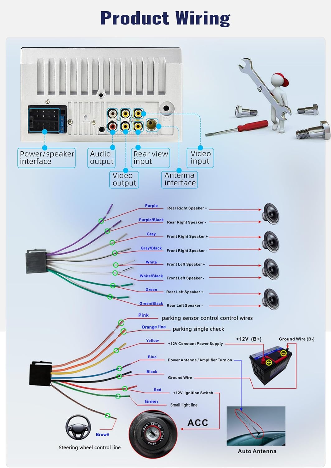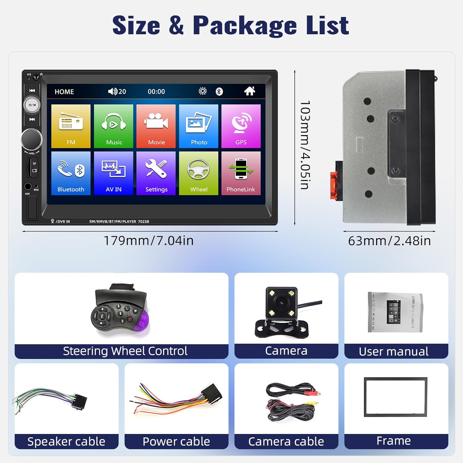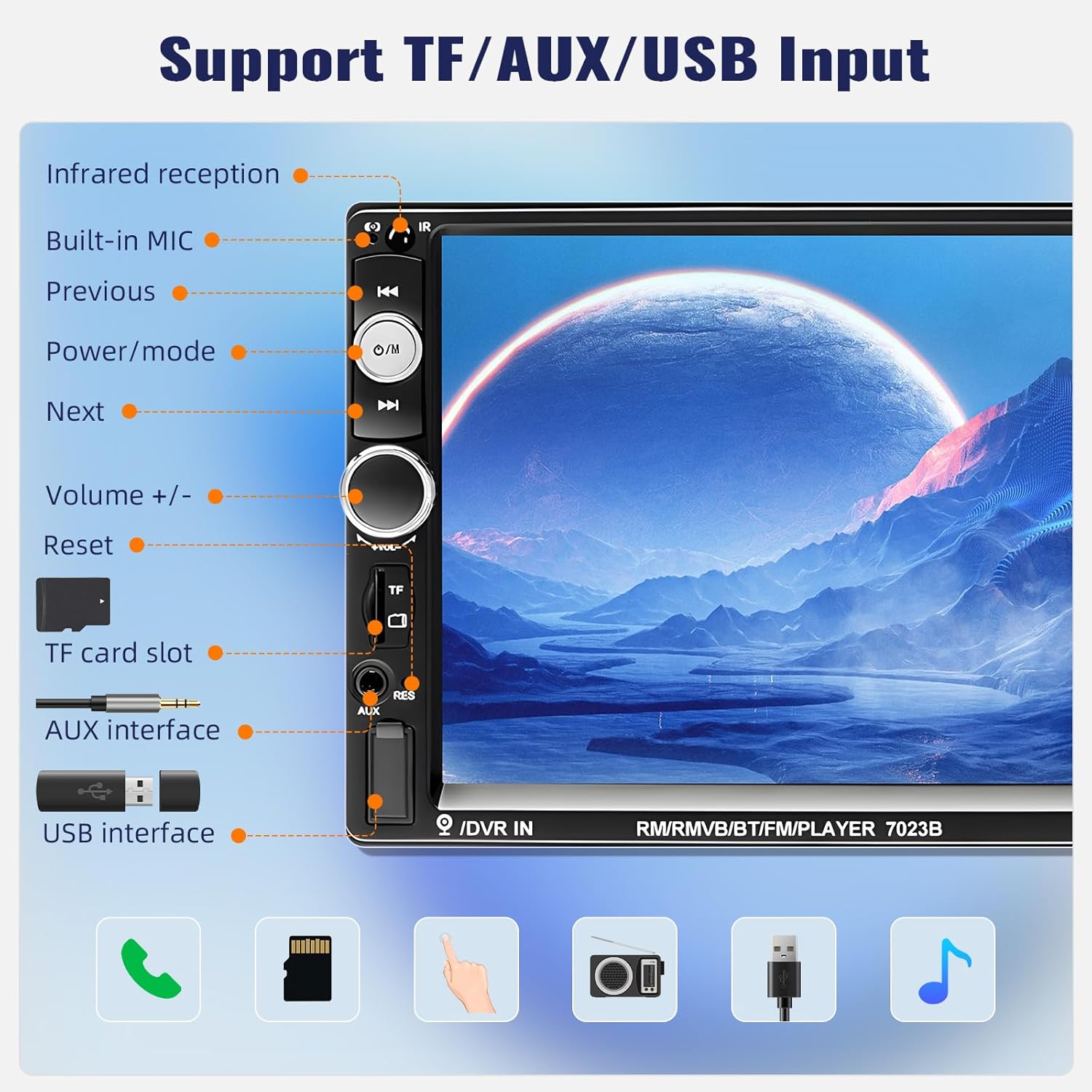 Със слот за SD/TF карта и AUX вход, USB порт. Завъртете бутона - продължително натискане за включване/изключване, кратко натискане за регулиране на яркостта, HUE, наситеността, контраста, силата на звука, EQ, FAD, BAL, TRE, BAS.