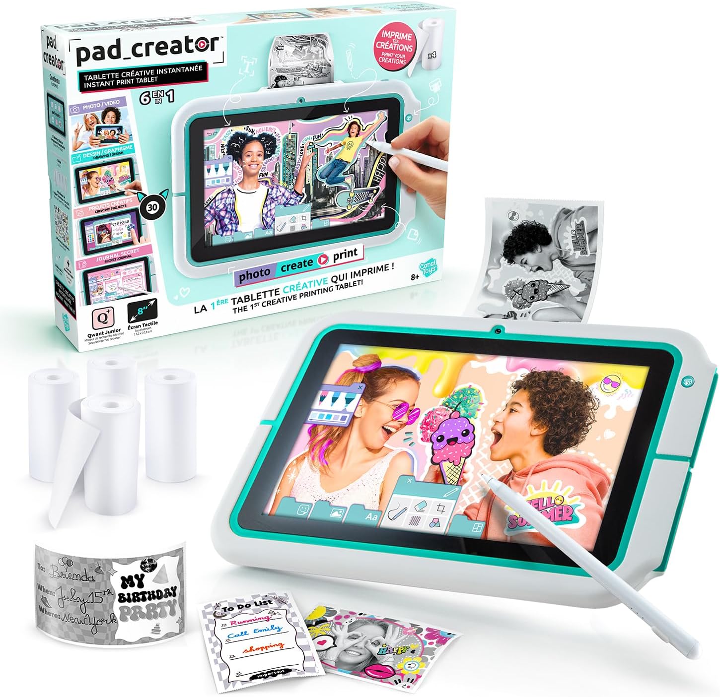 Ein integrierter Thermodrucker, der es Kindern ermöglicht, alle ihre Kreationen sofort zu drucken. Diese kostengünstige Druckmethode ermöglicht das Drucken von bis zu 70 Schwarzweißkopien ohne Tinte pro Rolle.