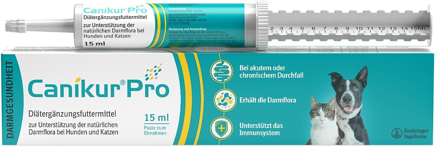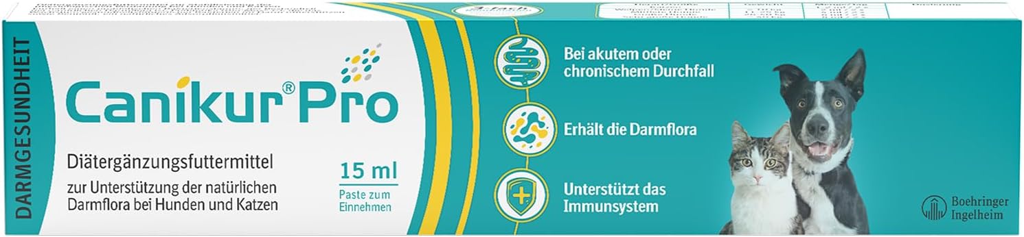 CanikurPro е про- и пребиотична хранителна добавка за кучета и котки, предназначена за регулиране на нормалното храносмилане. Може да се прилага като допълнение към лечението на диария, за да подпомогне чревната флора. За съжаление, диарията е една от най-честите причини, поради които търсим ветеринарна помощ за нашите домашни любимци. Когато куче или котка има диария, чревната му флора също е засегната. И обратно, променената чревна флора често води до диария. Дисбалансът в чревната флора може да бъде възстановен чрез прилагане на синбиотик.