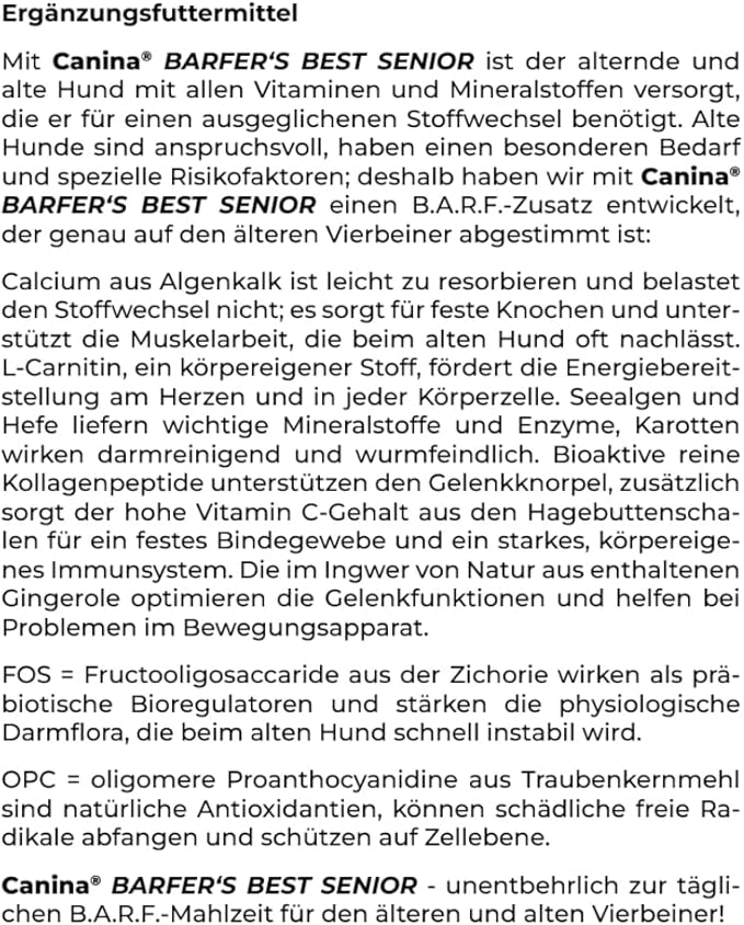 Canina BARFER'S BEST SENIOR осигурява на стареещите и възрастни кучета всички витамини и минерали, от които се нуждаят за балансиран метаболизъм. По-възрастните кучета са взискателни, имат специфични нужди и специфични рискови фактори; ето защо разработихме Canina BARFER'S BEST SENIOR, BARF добавка, прецизно пригодена за по-възрастни кучета: