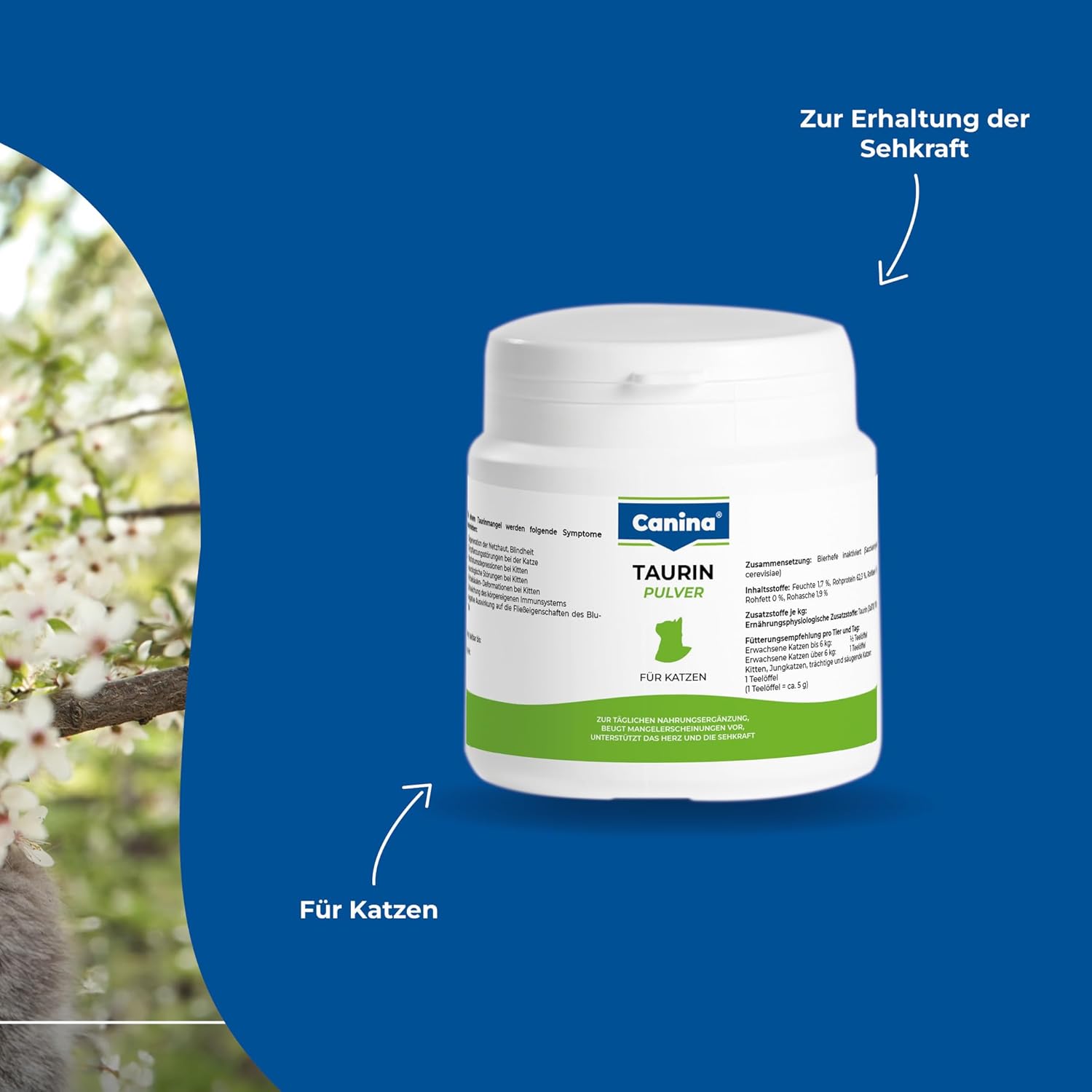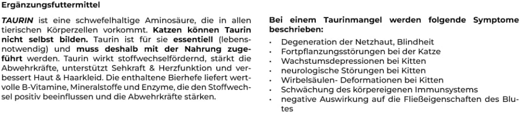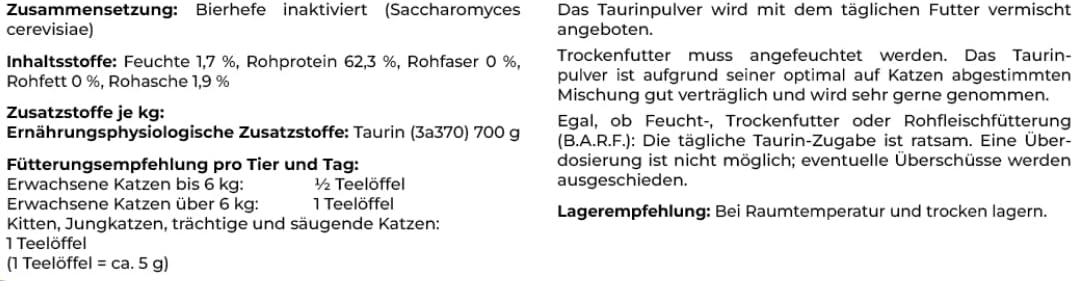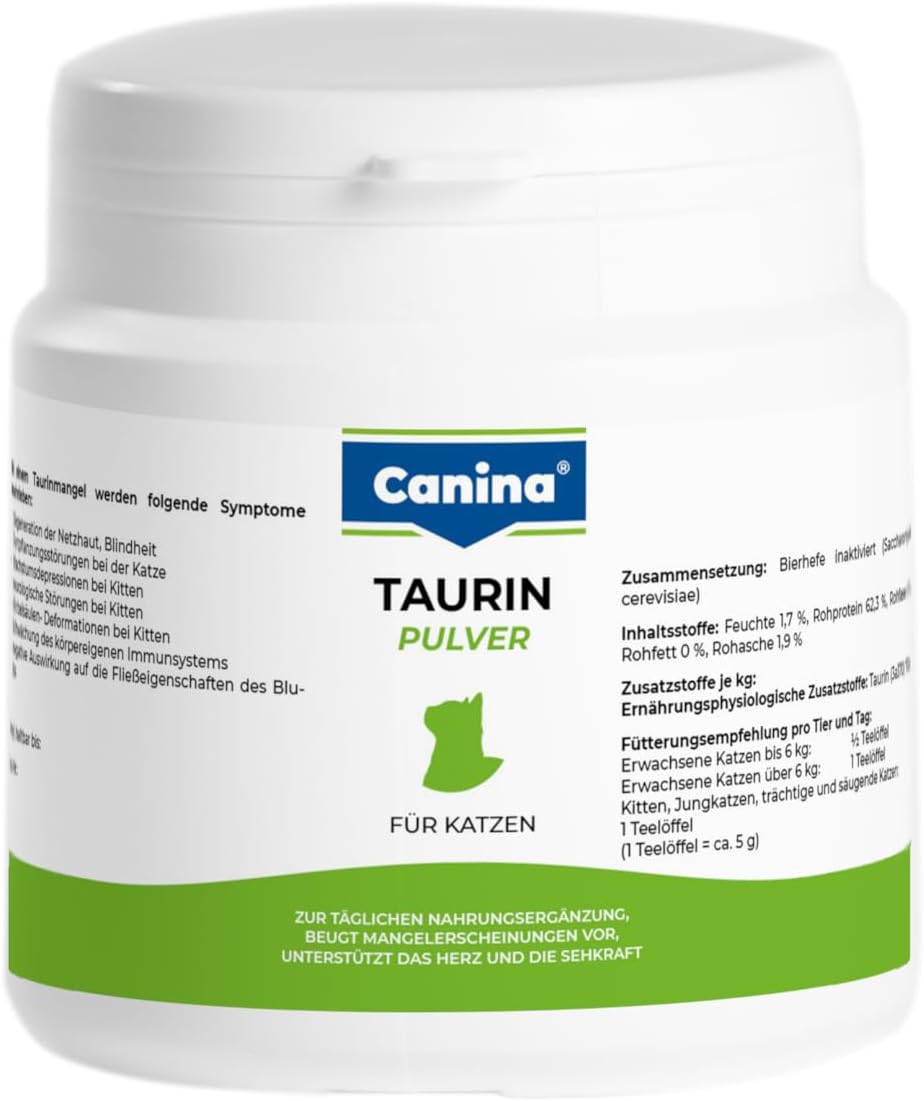 Fütterungsempfehlung pro Tier pro Tag:Erwachsene Katzen bis 6kg: 1/2 TelöffelErwachsene Katzen über 6kg: 1 TeelöffelKitten, Jungkatzen, trächtige und säugende Katzen: 1 Teelöffel(1 Teelöffel ca. 5g)Canina TAURIN FÜR KATZEN Pulver wird mit dem täglichen Futter vermischt angeboten. Trockenfutter muss angefeuchtet werden.Das Taurinpulver ist aufgrund seiner optimal für Katzen abgestimmten Mischung gut verträglich und wird sehr gerne genommen.Egal, ob Feucht-, Trockenfutter oder Rohfleischfütterung (B.A.R.F.): Die tägliche Taurin-Zugabe ist ratsam. Eine Überdosierung ist nicht möglich; eventuelle Überschüsse werden ausgeschieden.