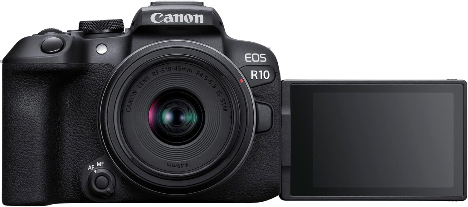 Canon EOS R10 Безогледален фотоапарат + обектив RF-S 18-45 mm F4.5-6.3 IS STM + адаптер EF-EOS R (Хибриден фотоапарат, DSLR надстройка, 15 F/s, 4K видеоклипове, Dual Pixel CMOS AF II система за фокусиране, WLAN) Черен