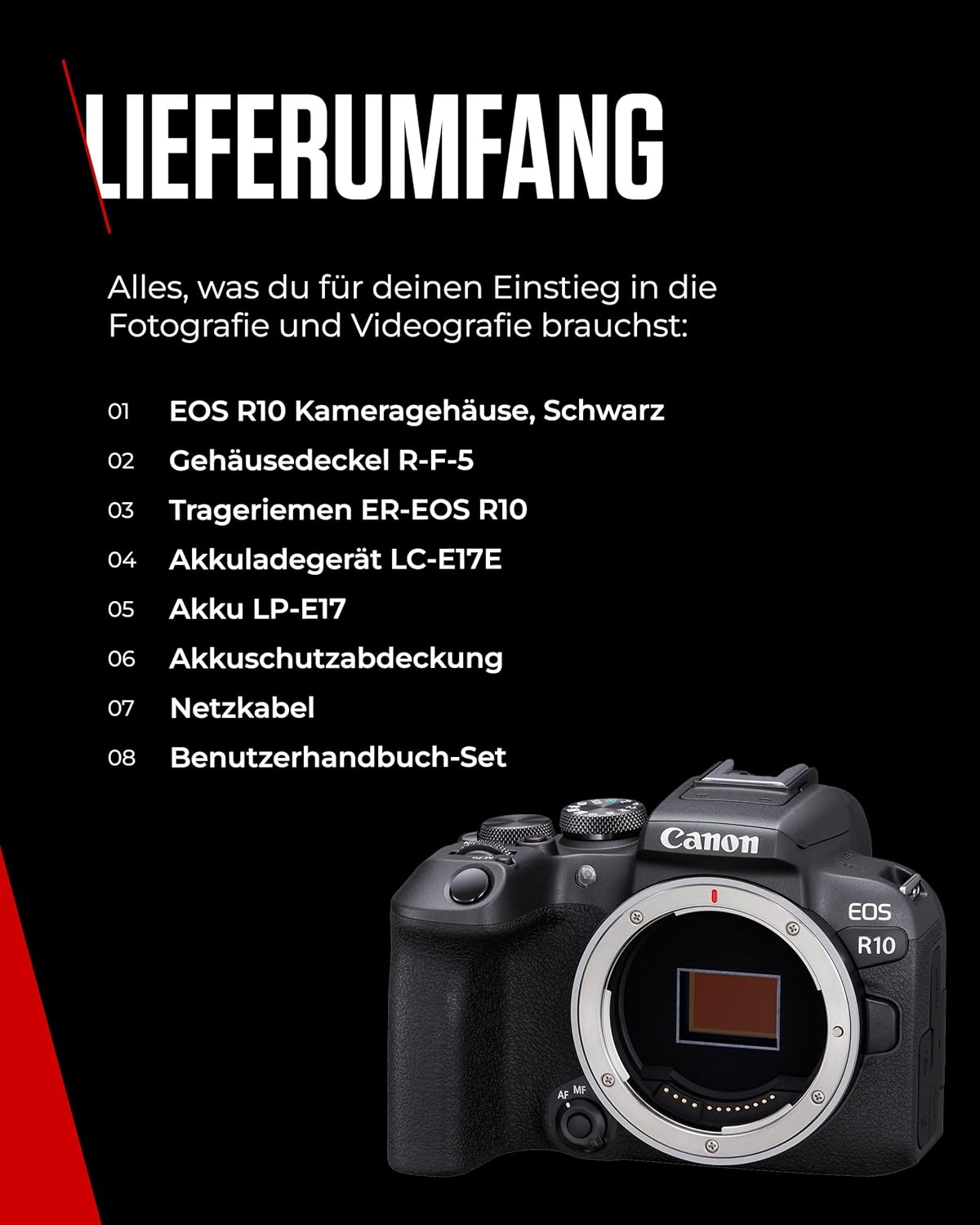 • Съдържание на кутията: тяло на фотоапарата EOS R10, обектив RF-S 18-45 mm F4.5-6.3 IS STM, капачка на корпуса на фотоапарата RF-5, каишка за носене ER-EOS R10, зарядно устройство за батерията LC-E17E, батерия LP-E17, капачка на обектива E-49, задна капачка на обектива RF