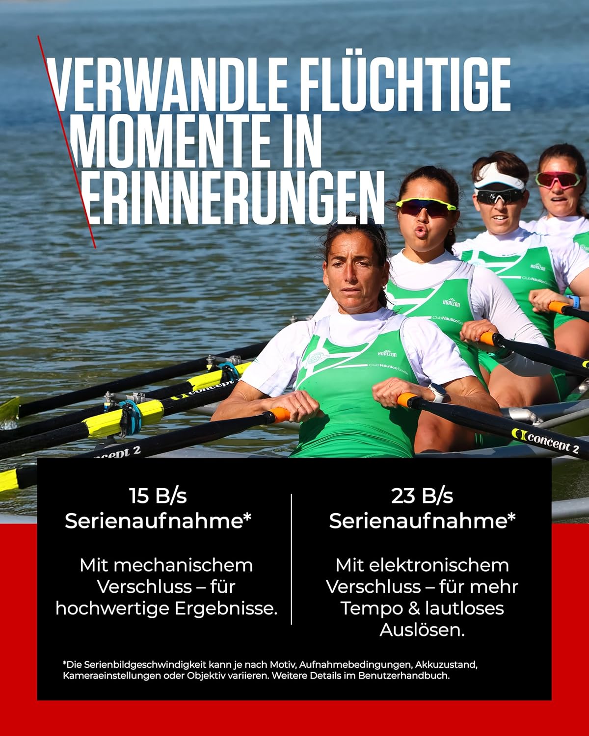 • Перфектен за приключения - Уловете важния момент с високоскоростно непрекъснато снимане - 15 кадъра в секунда или 23 кадъра в секунда. Форматът APS-C осигурява допълнителен телеобективен ефект.