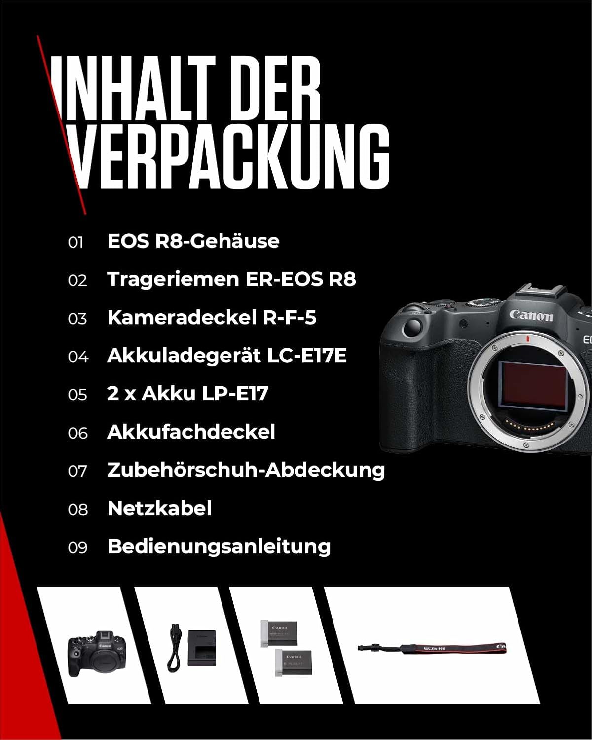 Изкачете се на следващото ниво с EOS R8. Лекият 24.2MP пълноформатен безогледален фотоапарат предлага допълнителни ъгли на видимост и красиво боке. Заснемайте моментите с до 40 кадъра в секунда и 30 кадъра в секунда в режим на RAW burst2, въртящ се сензорен екран с 1.62 милиона пиксела и EVF с 2.36 милиона пиксела. Снимане при слаба светлина до ISO 102.4003 (разширяемо до 204 800) при условия на осветеност до -6.5 LW4. Двупикселовият CMOS AF II с разпознаване и проследяване на мотиви по тяло, глава, лице, очи, животни и превозни средства осигурява прецизно фокусиране. С RAW, C-RAW, DPRAW, JPEG и HEIF, както и специални сценични режими, можете да задоволите всички нужди на снимане. Освен това, има 4K5 60p видеоклипове чрез свръхсемплиране на 6K данните от сензора с време за запис до 2 часа. 6, Full HD до 180p (без звук), предварителен видеозапис, дисплей с фалшиви цветове и Canon LOG 3, както и 3,5 мм мини жак и многофункционален гнездо за аксесоари, WLAN (Wi-Fi7), постоянно Bluetooth сдвояване, image.canon, USB-C и USB-C, както и USB-C и USB-C AC осигуряват оптимални връзки. 1. Отговаря на тестовите стандарти на Canon. Броят на снимките зависи от настройките и използвания обектив. 2. В режим на RAW серийно снимане, експозицията се определя само за първото изображение. 3. Отклоняваща се ISO чувствителност, когато Canon Log 3 или тоналната стойност са зададени като приоритет. Разширената ISO чувствителност не е налична в HDR режим или HDR запис. 4. При снимане с F1.2, централно AF поле, еднократен AF, при 23°C, ISO 100. С изключение на RF обективи с Defocus Smoothing. 5. Свръхсемплиране на 6K данни от сензора. 6. Ако вътрешната температура на камерата е твърде висока, максималното време за запис се намалява. 7. Използването на Wi-Fi (Wi-Fi) може да е ограничено в определени страни или региони.