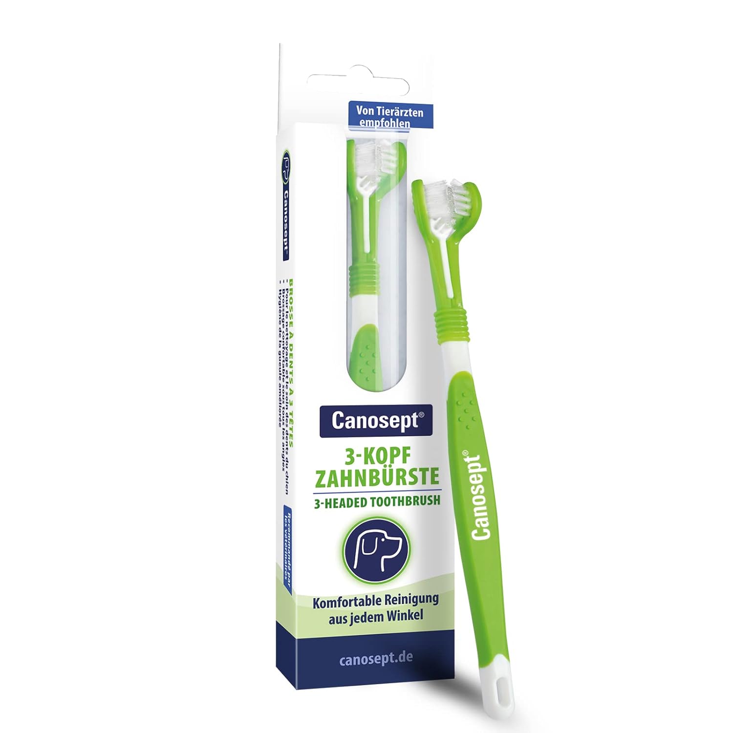 Грижата за зъбите не е лесна, но е съществена част от цялостното благополучие на вашето куче. Храната, любимите играчки и дори от време на време лакомствата допринасят за устната хигиена на вашето куче и всички остатъци трябва да се отстраняват редовно. Четката за зъби Canosept с 3 глави ефективно почиства зъбите от всеки ъгъл: уникалният дизайн на четката ви позволява да почистите старателно както дъвкателните повърхности, така и страните на зъбите с една лесна стъпка. Ергономично оформената дръжка я прави лесна и удобна за употреба и дори труднодостъпните места се почистват ефективно от плака. Почистването с четката за зъби Canosept с 3 глави помага за предотвратяване на възпаления и заболявания в устната кухина. Кученцата, по-специално, лесно се адаптират към рутинната грижа за зъбите – така че започнете рано да запознавате кучето си с инструменти като четката за зъби с 3 глави и зъбния гел Canosept. Дори кучета, които не свикват лесно с четка за зъби, не бива да се отказват от редовното почистване. В този случай използвайте четката за пръсти Canosept Dental Care или, за бързо почистване в движение, подложките за пръсти Canosept Dental Care. Друга бърза алтернатива за лош дъх е спреят за дентална хигиена Canosept. Просто го напръскайте и кучето веднага ще разнесе почистващия спрей в устата си с езика си. С разнообразната гама продукти за дентална хигиена Canosept можете да придружавате кучето си от кученце до старост и да му осигурите оптимална дентална хигиена за цял живот.