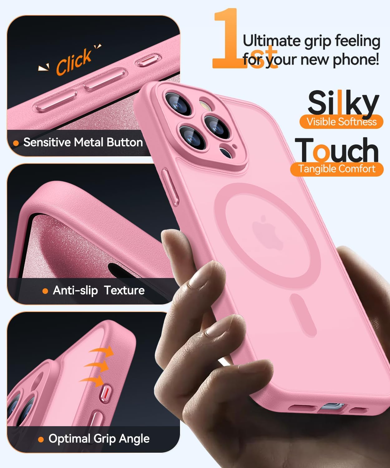 CANSHN 2024 Калъф за iPhone 15 Pro със защита на камерата за Magsafe (най-добра военна защита и магнитна сила) Изключително издръжлив, удароустойчив, розов