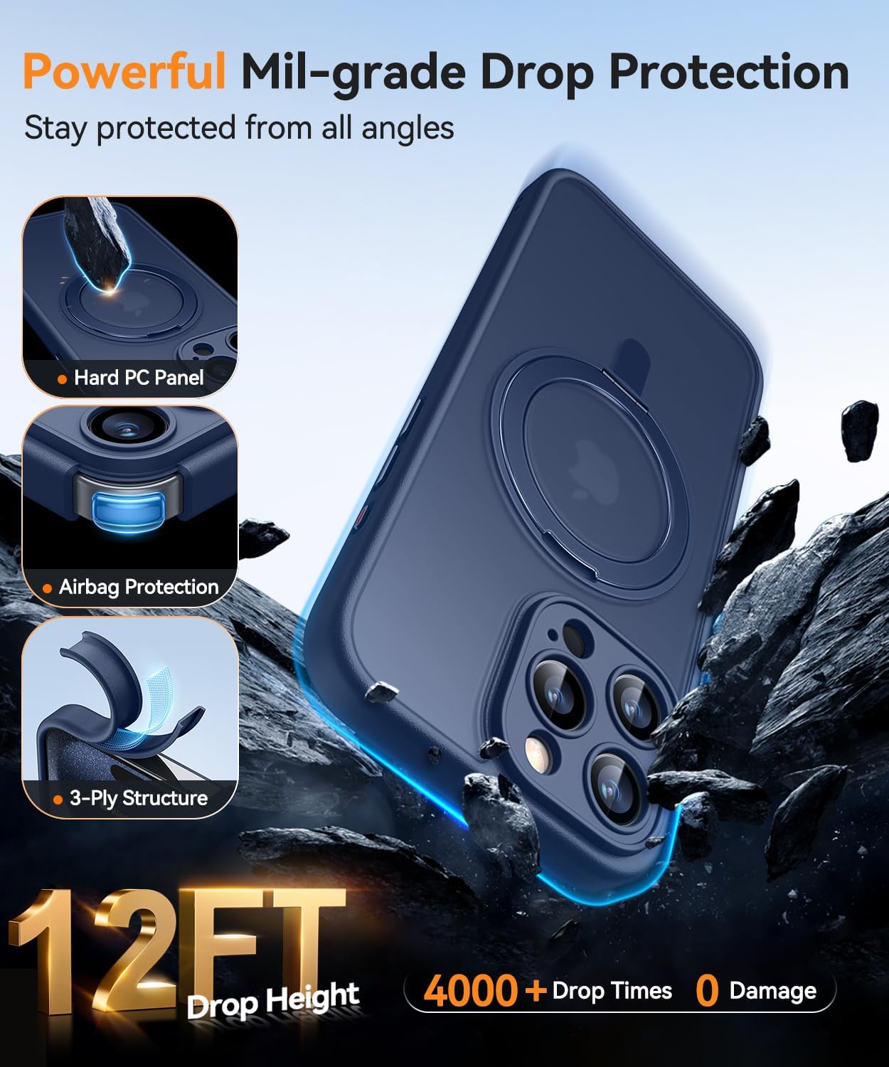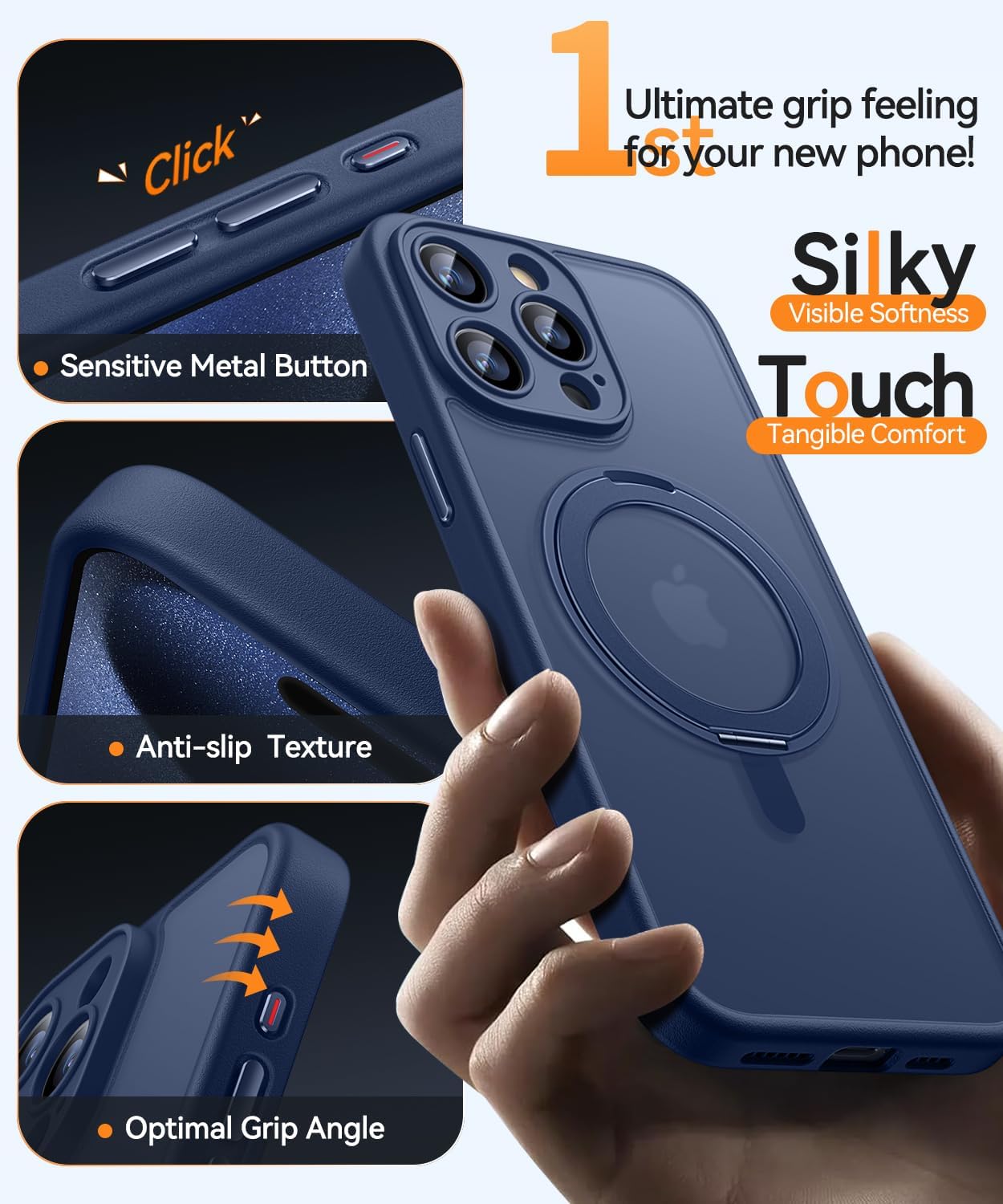 CANSHN 360° стойка за iPhone 15 Pro Max със защита на камерата за Magsafe (магнитен здрав пръстен за стойка), матово тъмносин