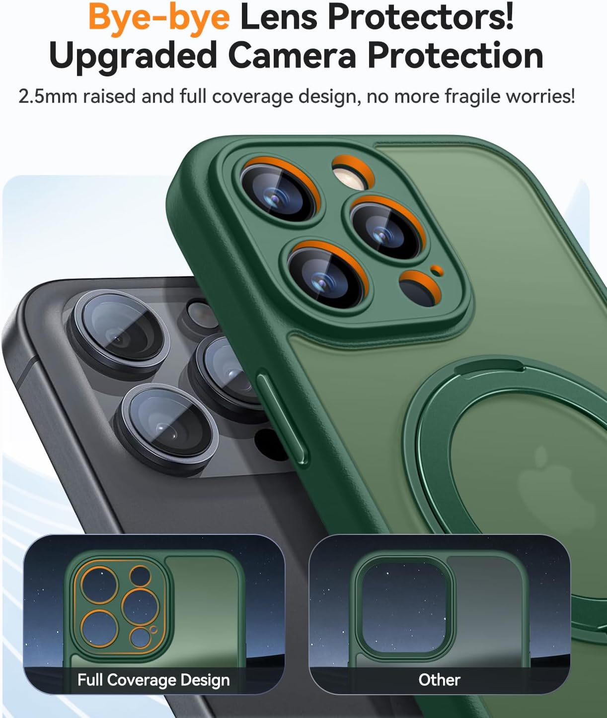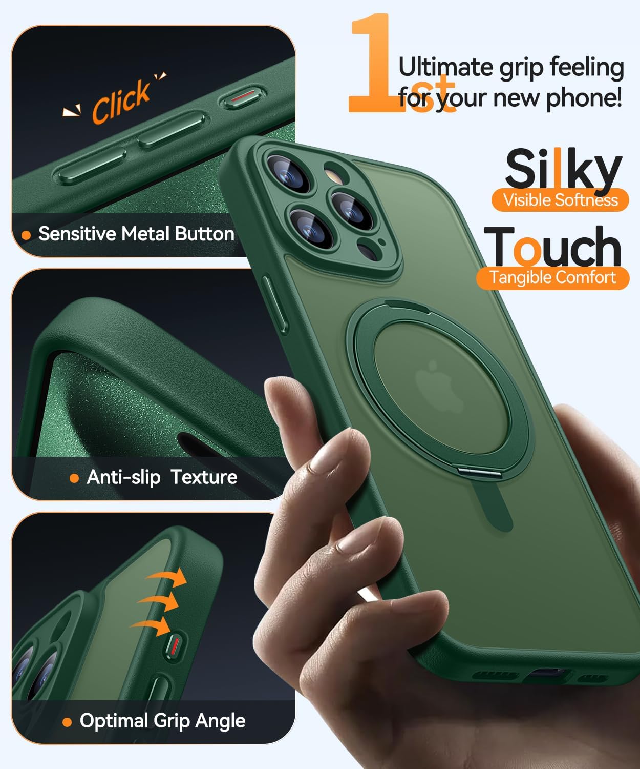 CANSHN 360° стойка за iPhone 15 Pro Max със защита на камерата за Magsafe (магнитен здрав пръстен за стойка), матово тъмнозелено