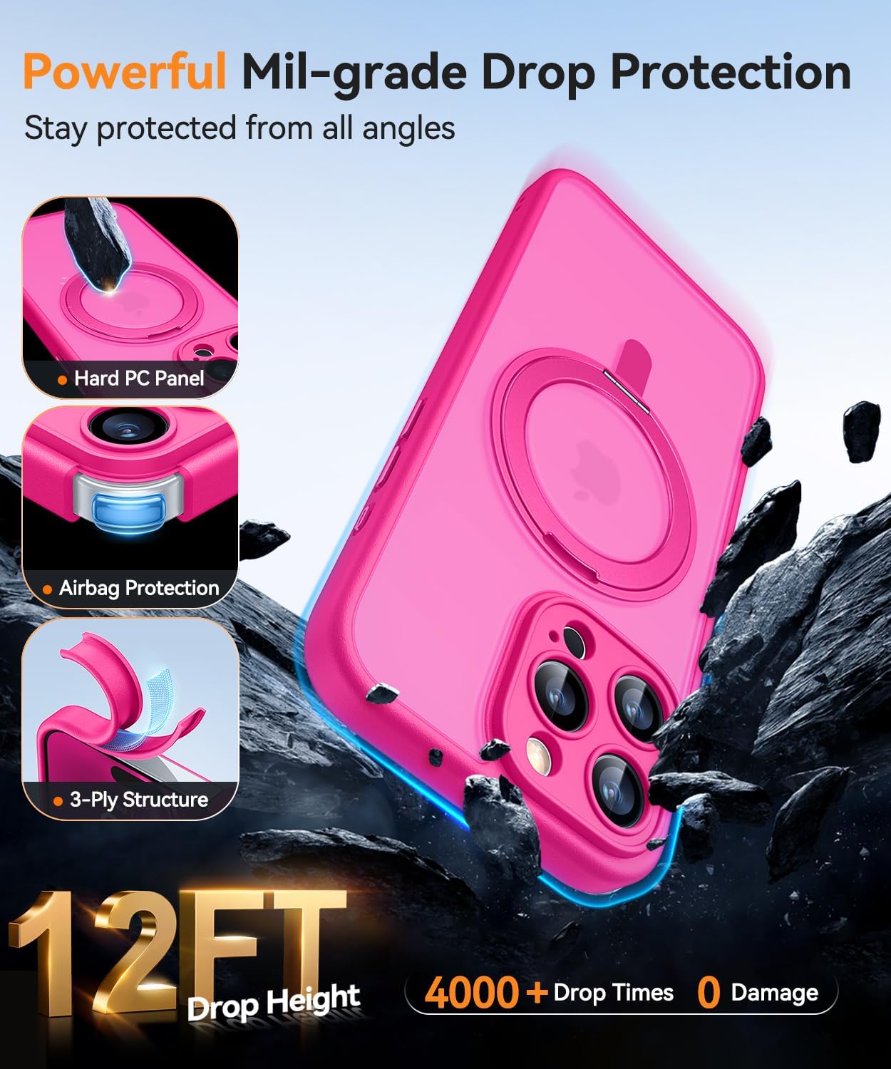 CANSHN 360° стойка за iPhone 15 Pro с Magsafe защита на камерата (магнитен здрав пръстен за стойка), матово ярко розово