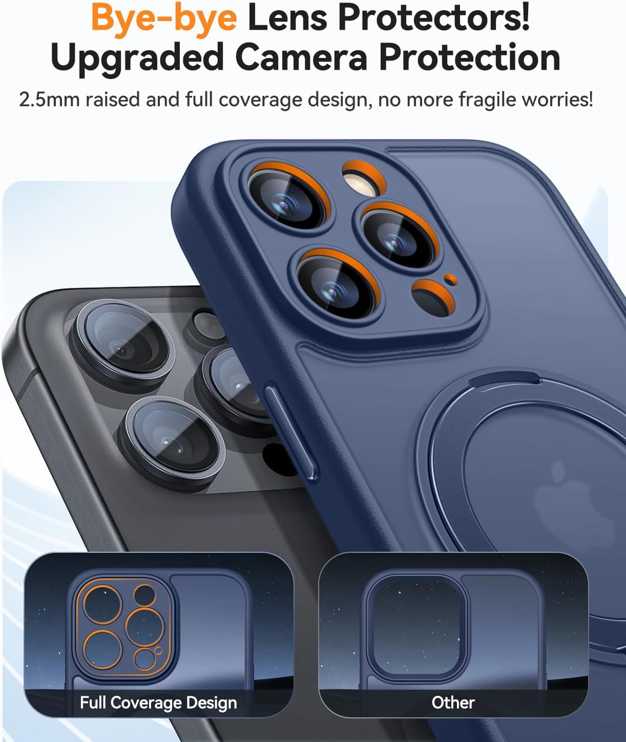 CANSHN 360° стойка за iPhone 15 Pro с Magsafe защита на камерата (магнитен здрав пръстен за стойка), матово тъмносин