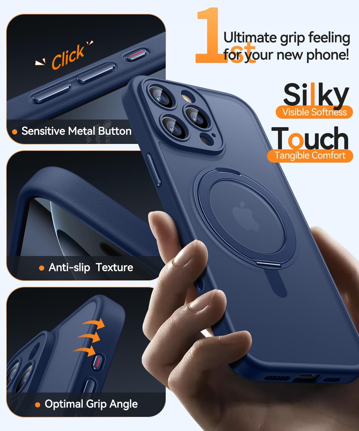 CANSHN 360° стойка за iPhone 16 Pro с предпазител на камерата [бутон за управление на камерата] за Magsafe (магнитен здрав пръстен за стойка), матово тъмносин