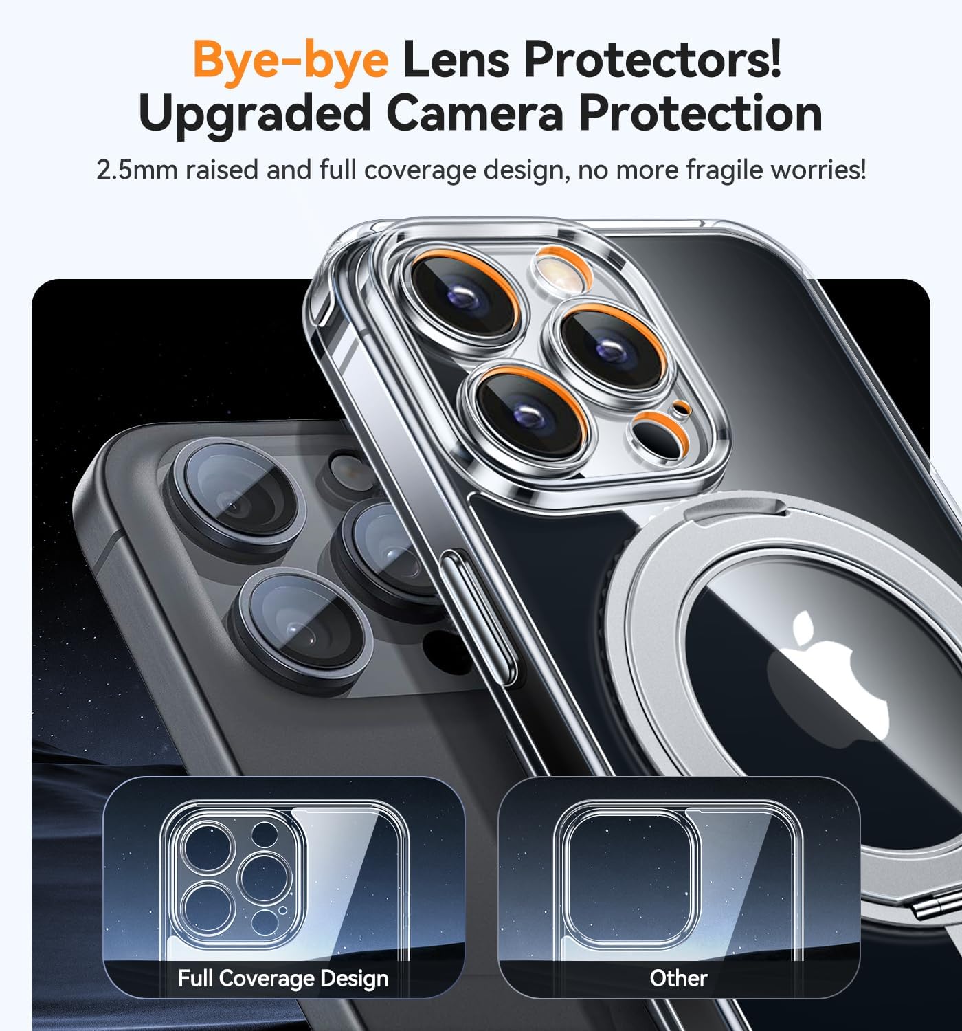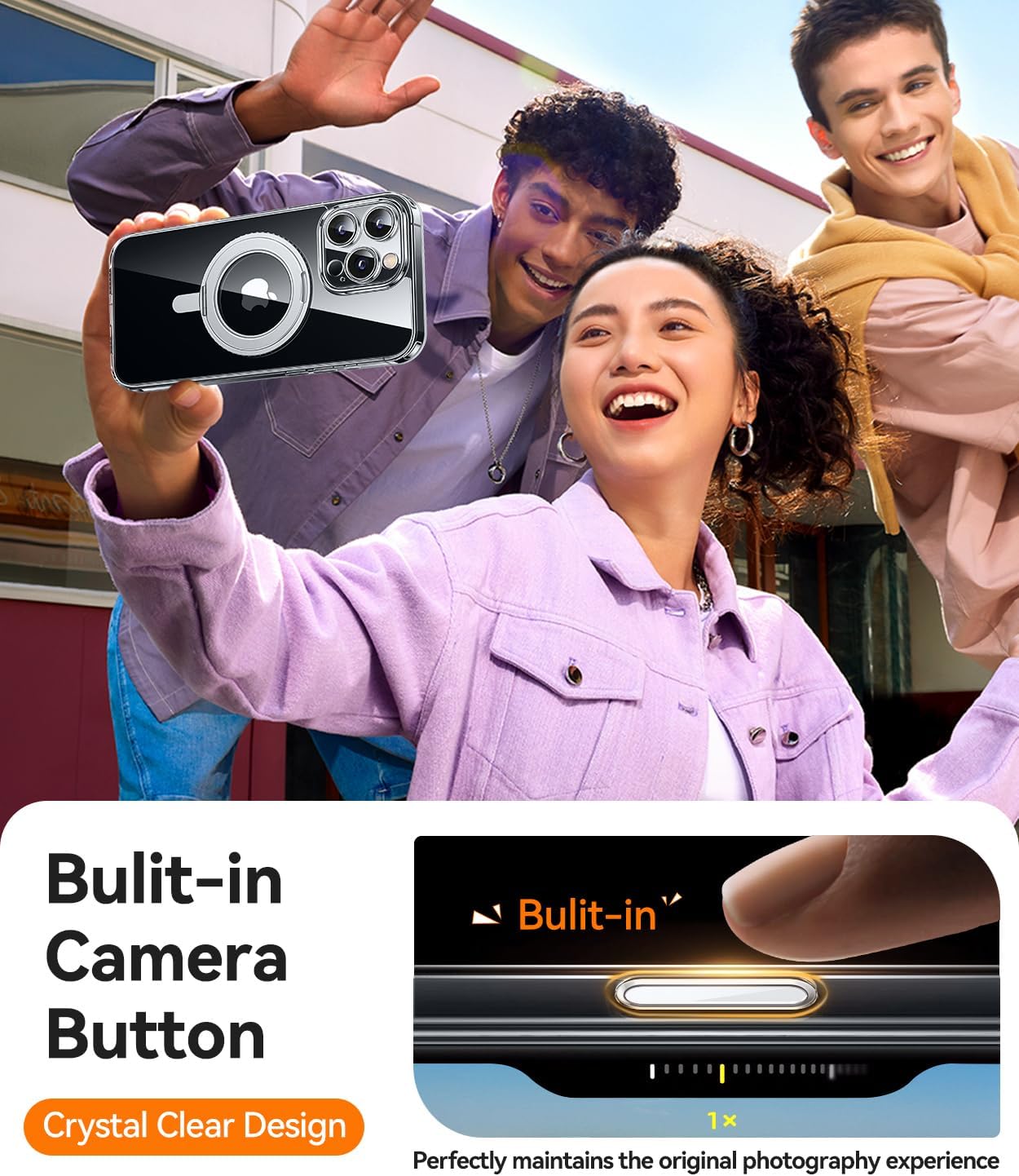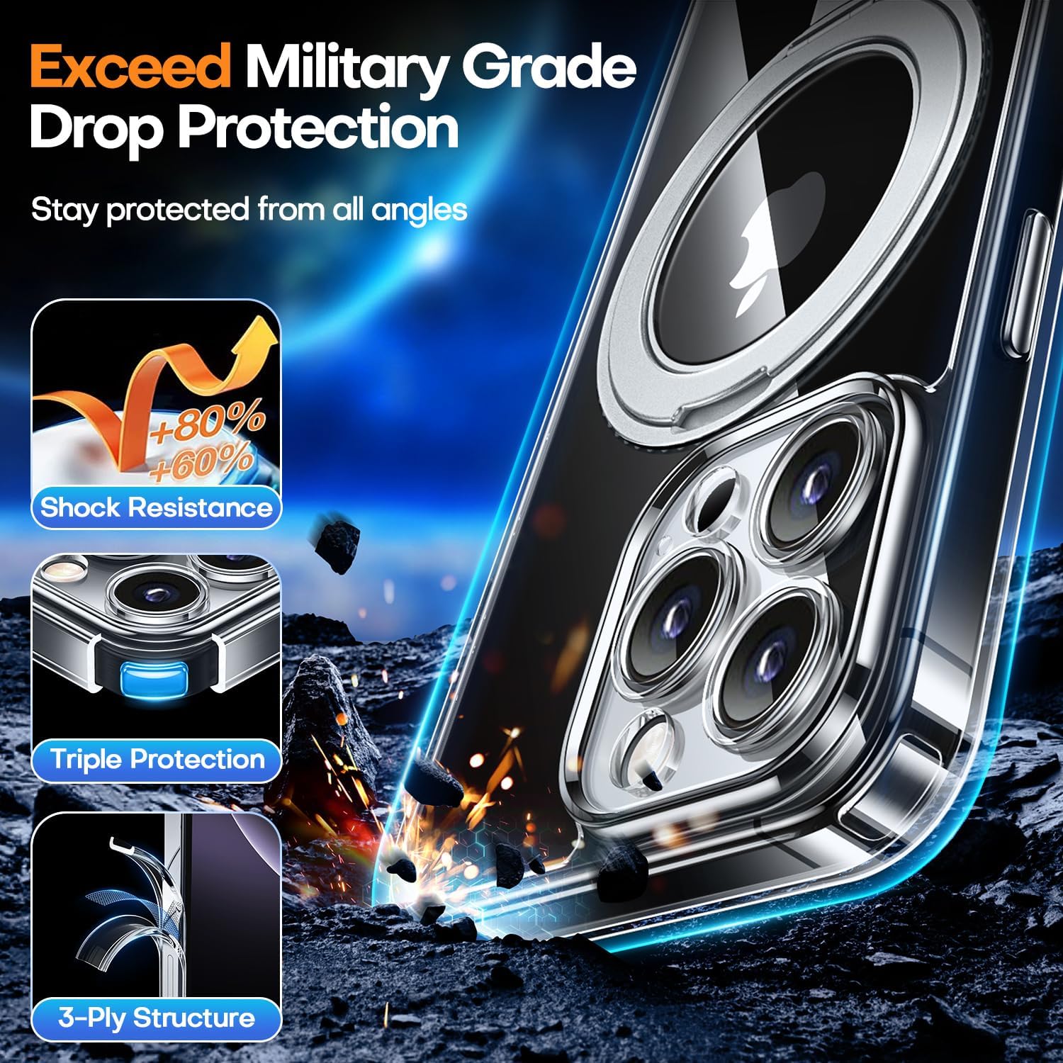 CANSHN 360° стойка за iPhone 16 Pro с предпазител на камерата [бутон за управление на камерата] за Magsafe (магнитен здрав пръстен за стойка), прозрачна