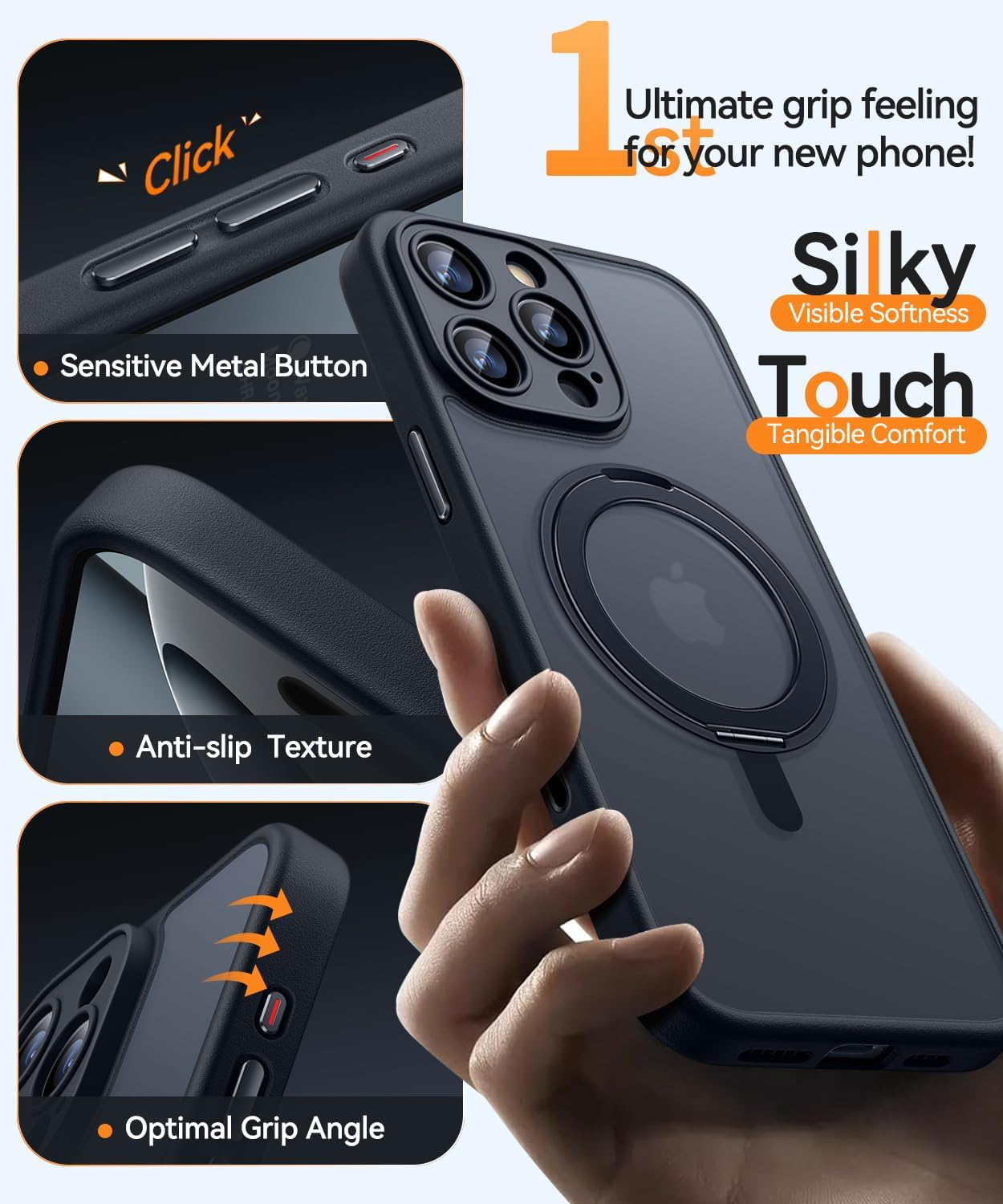 CANSHN 360° стойка за iPhone 16 Pro с предпазител за камерата [бутон за управление на камерата] за Magsafe (магнитен здрав пръстен за стойка), матово черно