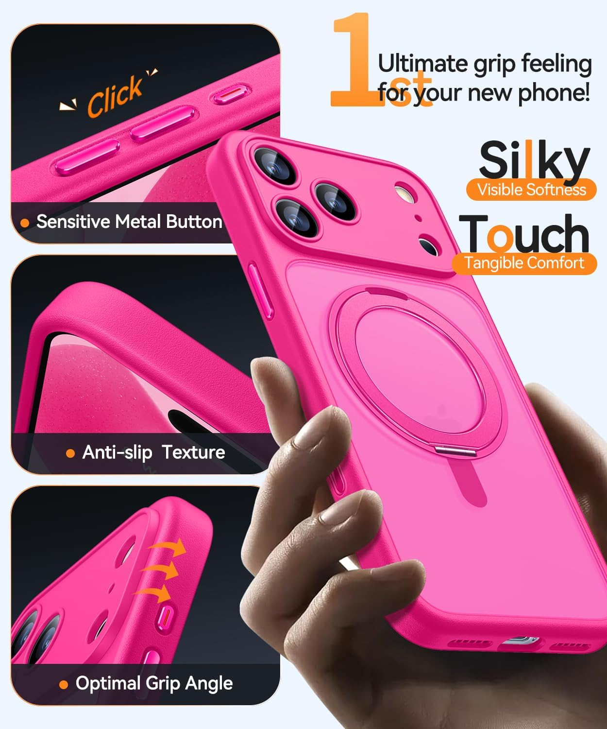 CANSHN 360° стойка за iPhone 17 Pro, калъф със защита на камерата [бутон за управление на камерата] за Magsafe (магнитен здрав пръстен за стойка), матово ярко розово