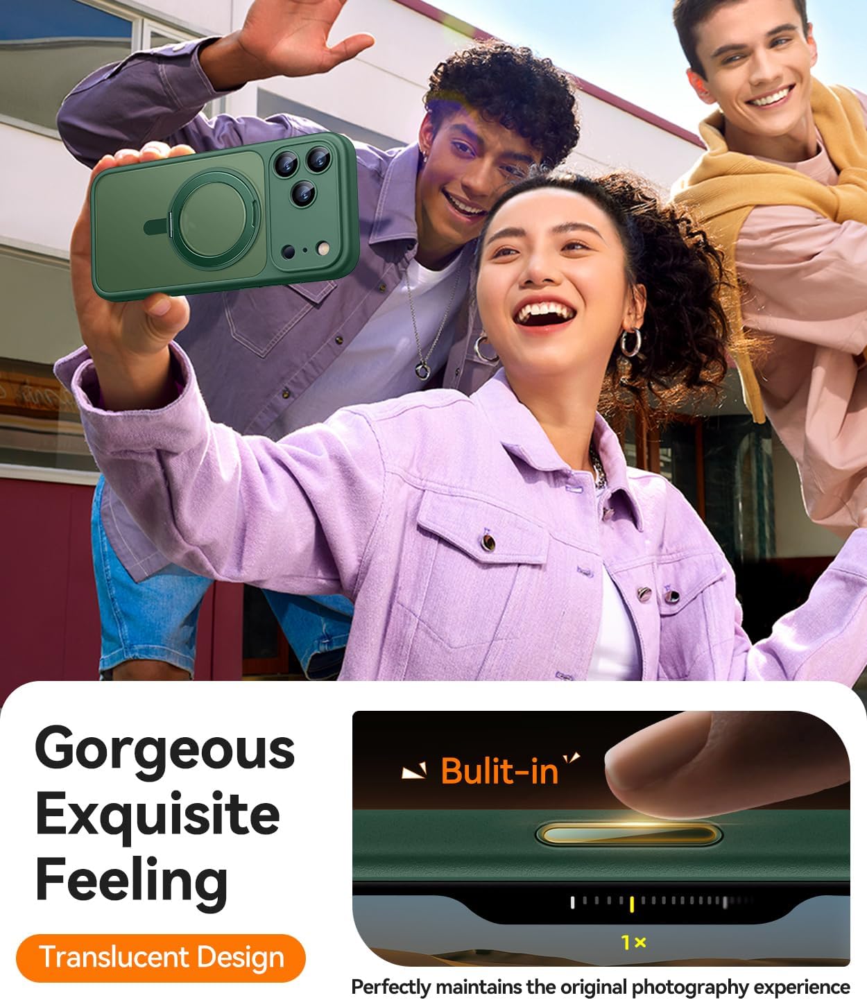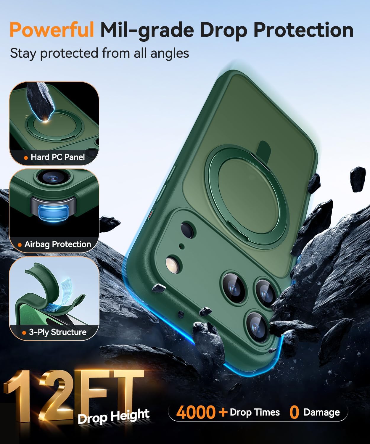 CANSHN 360° стойка за iPhone 17 Pro, калъф със защита на камерата [бутон за управление на камерата] за Magsafe (магнитен здрав пръстен за стойка), матово тъмнозелено