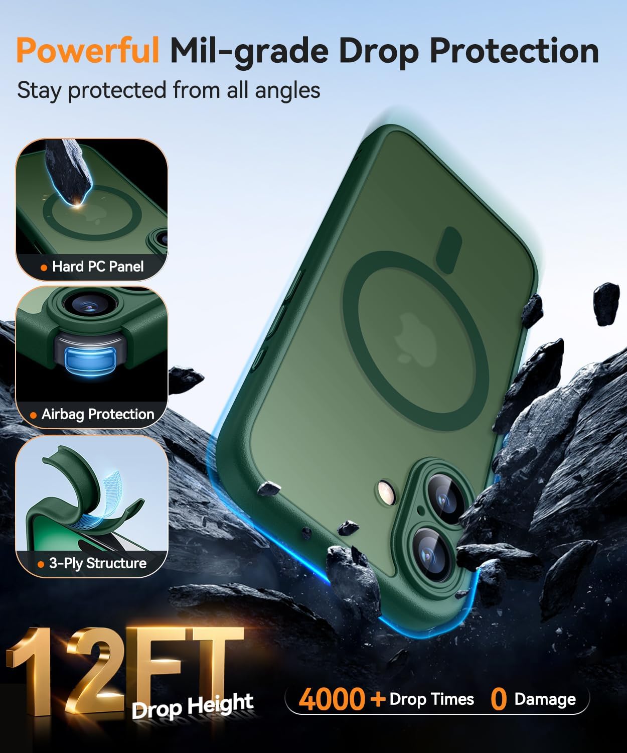 CANSHN калъф за iPhone 16 със защита на камерата за Magsafe (най-висока военна защита и магнитна сила) изключително издръжлив, удароустойчив, тъмнозелен
