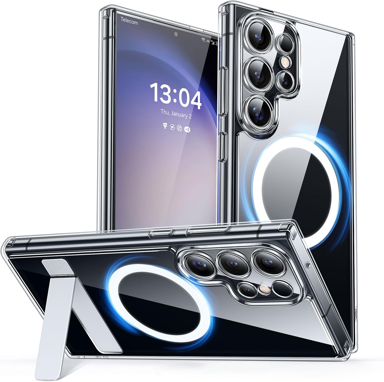 CANSHN Кейс със стойка за Samsung Galaxy S23 Ultra, съвместим с MagSafe (магнитна сила № 1, защита на камерата) - прозрачен