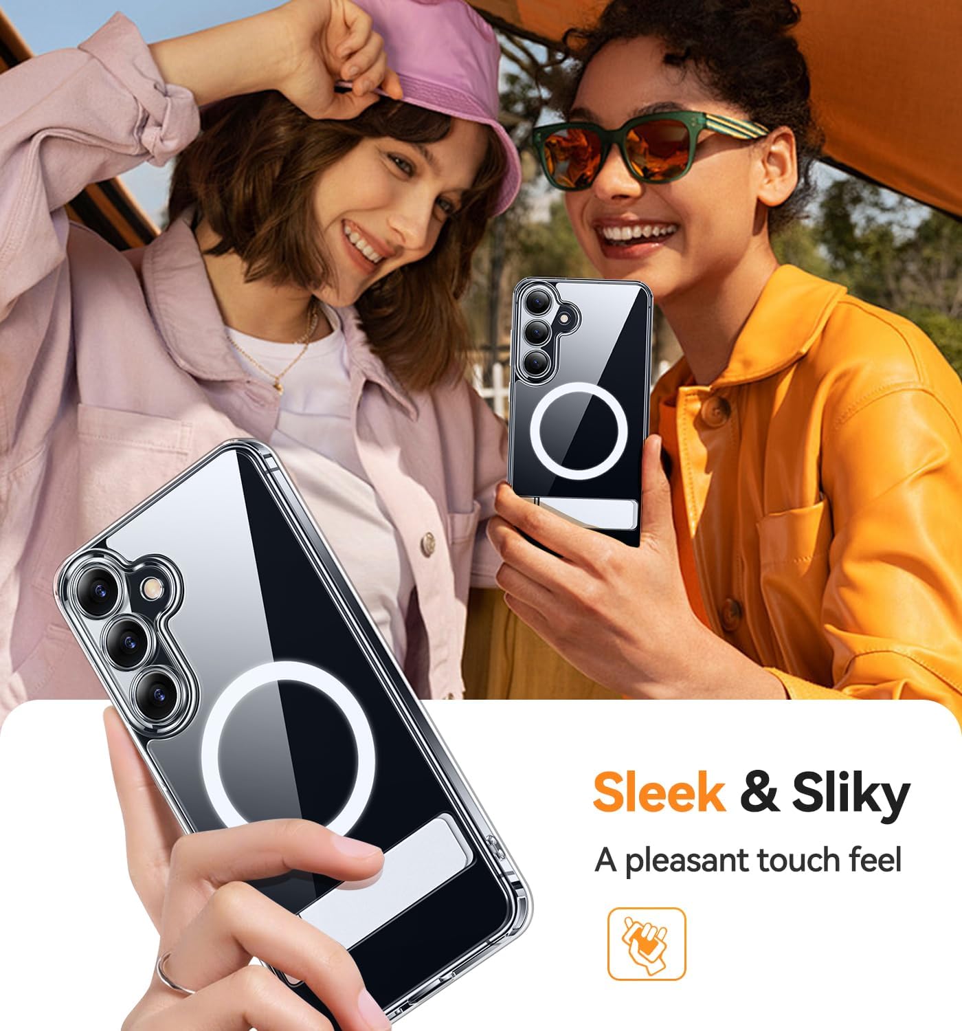 CANSHN Кейс със стойка за Samsung Galaxy S25 Plus, съвместим с MagSafe (магнитна сила № 1, защита на камерата) - прозрачен