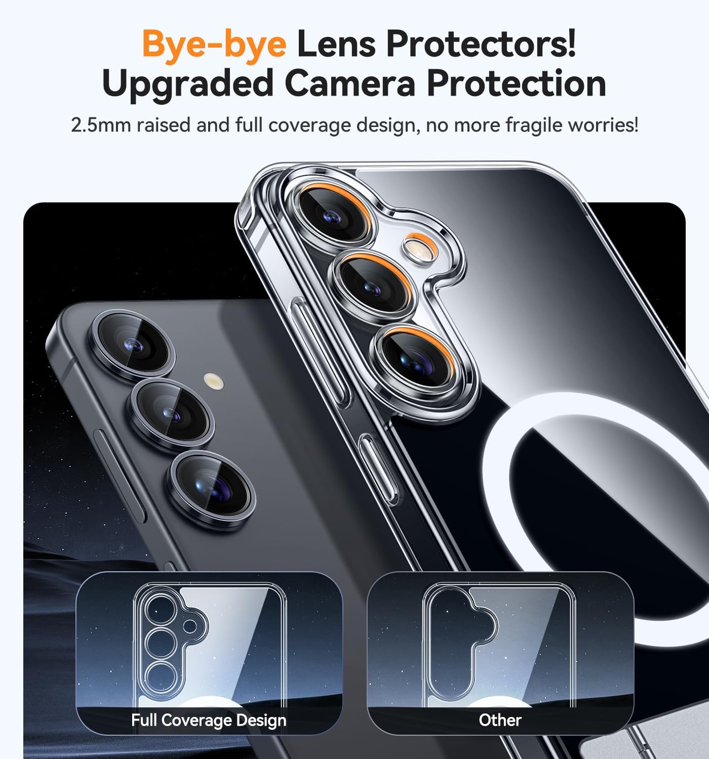 • [Подобрена пълна защита на камерата] Кажете сбогом на конвенционалните протектори за обективи! В сравнение с други обикновени калъфи за телефони, нашият калъф за Samsung Galaxy S25 предлага подобрена цялостна защита за камерата, с 2,5 мм висок ръб около обектива. Той осигурява цялостна защита за обектива, без да прави компромис със снимките.