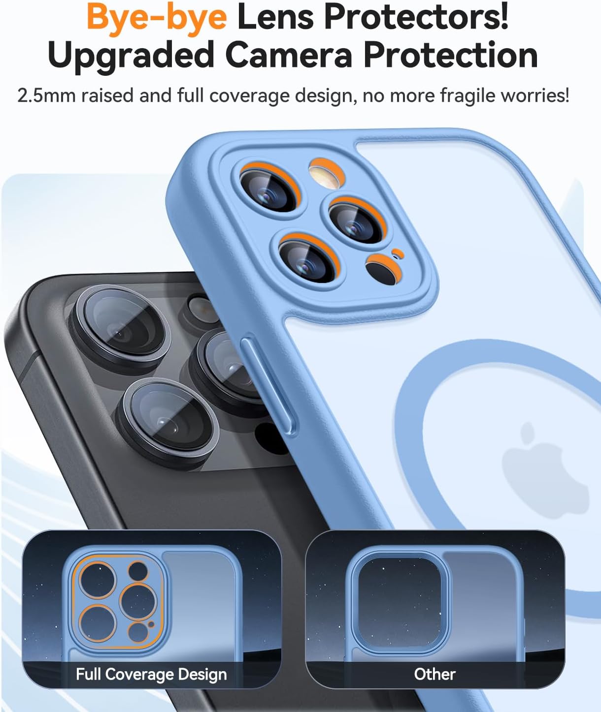 • Подобрена пълна защита на камерата: Кажете сбогом на конвенционалните протектори за обективи! В сравнение с други обикновени калъфи за телефони, нашият калъф за iPhone 15 предлага подобрена цялостна защита за камерата, с 2,5 мм висок ръб около обектива. Той осигурява цялостна защита за обектива, без да прави компромис с фотографията.