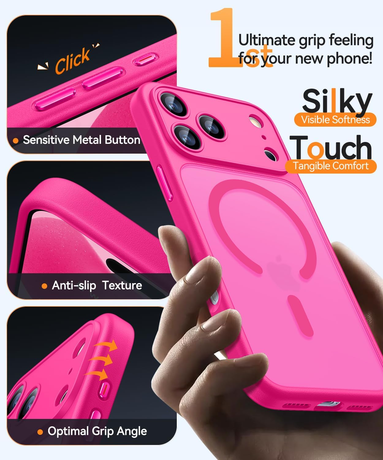 CANSHN Кейс за iPhone 17 Pro със защита на камерата за Magsafe (най-висока военна защита и магнитна сила) Изключително издръжлив кейс за iPhone 17 Pro, удароустойчив, ярко розов