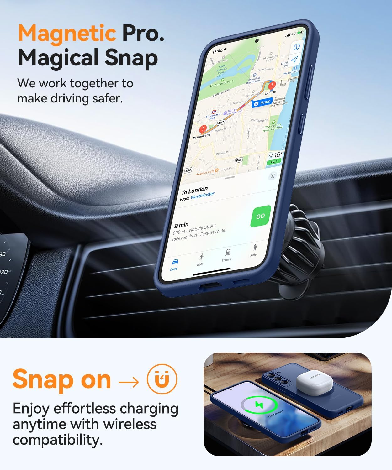 • [Силно магнитно привличане] С вградени мощни N52 магнити, този калъф за Samsung Galaxy S25 е напълно съвместим със зарядни устройства MagSafe. Той се свързва здраво и с други магнитни аксесоари, като магнитни портфейли, външни батерии и стойки за кола, осигурявайки сигурна и стабилна връзка, дори по време на въртене или движение.