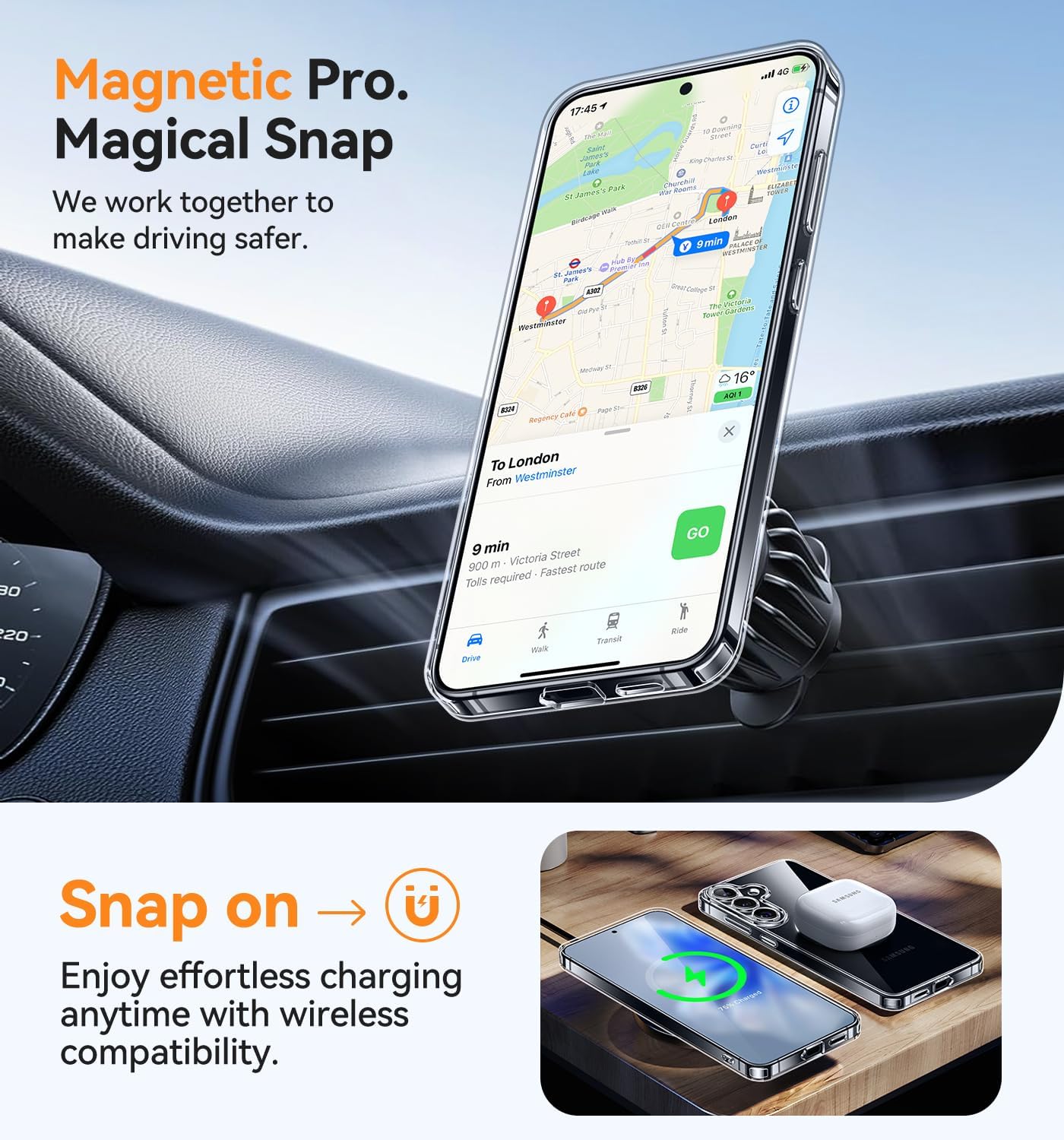 • [Силно магнитно привличане] С вградени мощни N52 магнити, този калъф за Samsung Galaxy S25 е напълно съвместим със зарядни устройства MagSafe. Той се свързва здраво и с други магнитни аксесоари, като магнитни портфейли, външни батерии и стойки за кола, осигурявайки сигурна и стабилна връзка, дори по време на въртене или движение.