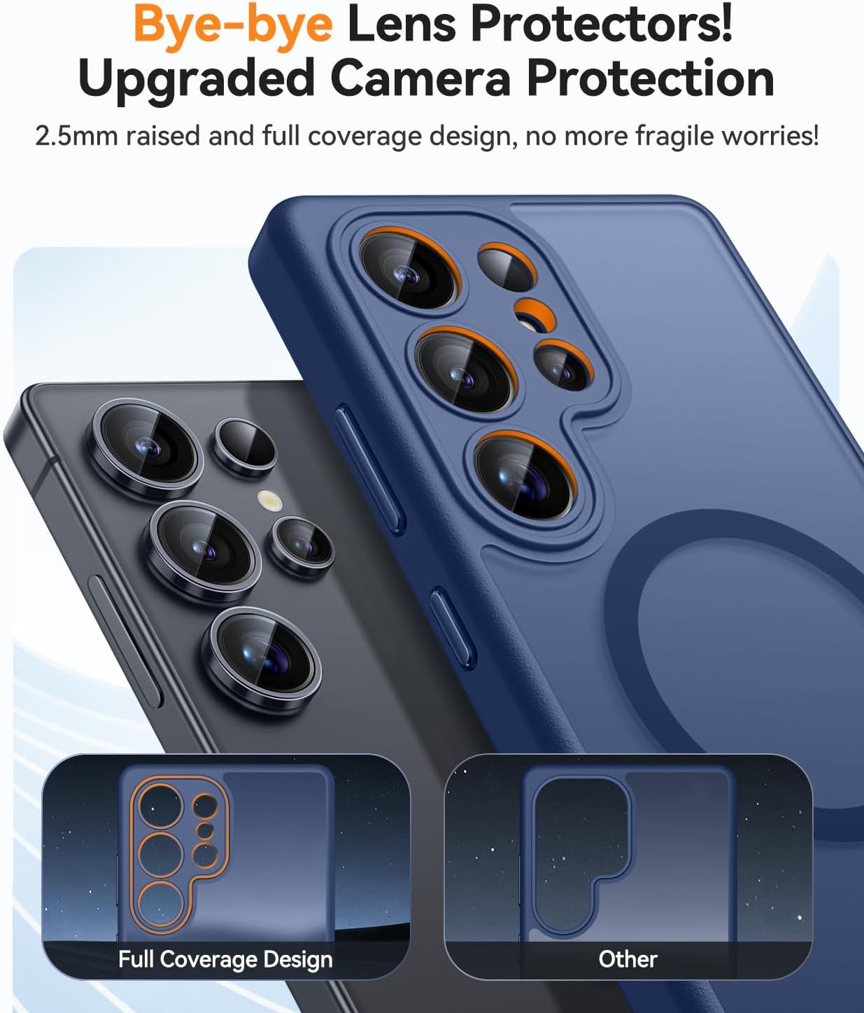 • [Подобрена пълна защита на камерата] Кажете сбогом на конвенционалните протектори за обективи! В сравнение с други обикновени калъфи за телефони, нашият калъф за Samsung Galaxy S25 предлага подобрена цялостна защита за камерата, с 2,5 мм висок ръб около обектива. Той осигурява цялостна защита за обектива, без да прави компромис със снимките.