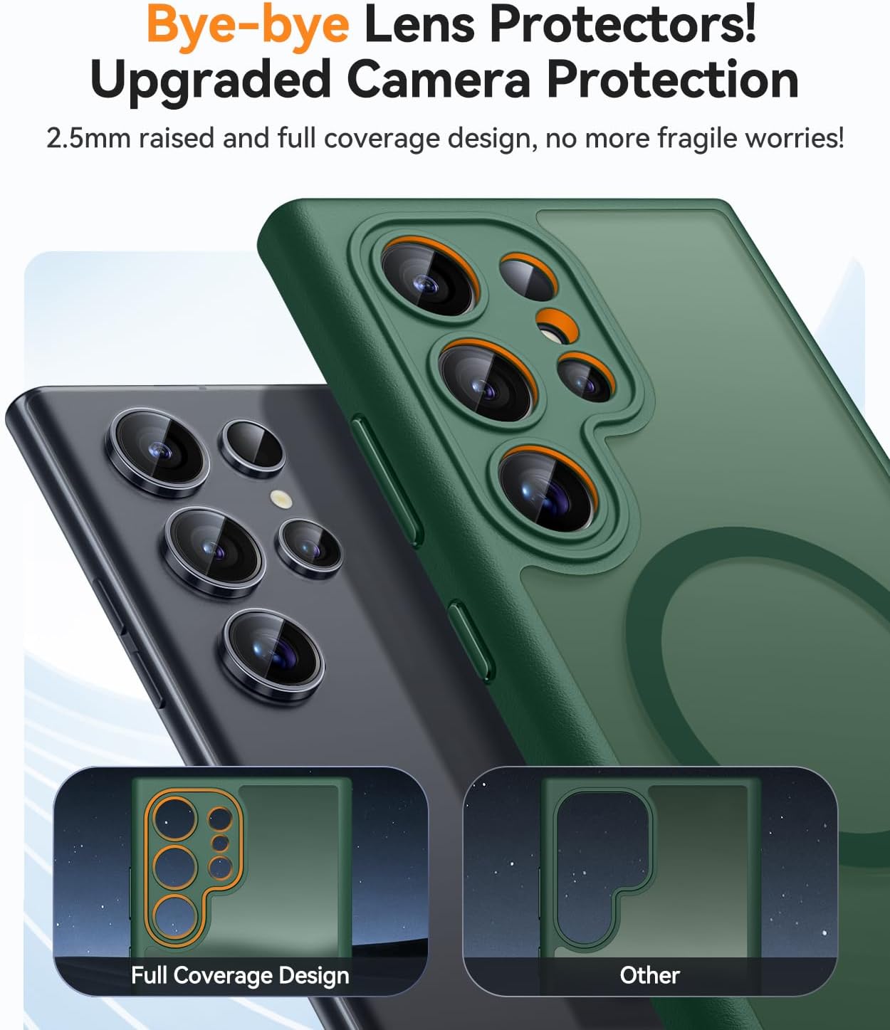 • [Подобрена пълна защита на камерата] Кажете сбогом на конвенционалните протектори за обективи! В сравнение с други обикновени калъфи за телефони, нашият калъф за Samsung Galaxy S25 предлага подобрена цялостна защита за камерата, с 2,5 мм висок ръб около обектива. Той осигурява цялостна защита за обектива, без да прави компромис със снимките.